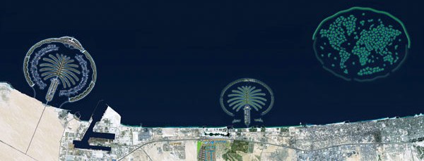 Three island chains are being constructed out in the shallow waters of the Gulf which, when viewed from outer space, resemble the fronds of a palm tree and a miniature view of the world. These are ‘The World’, "Jebel Ali Palm," bigger than Manhattan, and the smaller "Palm Jumeirah”.