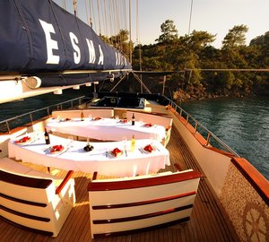 Aft of the main saloon the exterior aft deck area offers a great space to relax and unwind with a large sofa and coffee table, as well as a shaded alfresco dining area. Another seating area, with seating around a romantic fire pit, is found on the bridge deck together with sun loungers.