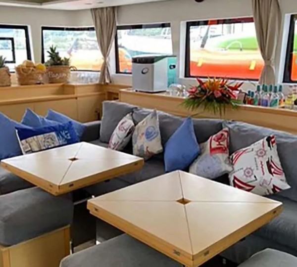 Her salon offers a large circular couch in brown warm leather to the port side, also used as a dining area when the glass table is up. It faces the TV screen and cabinet and is located just before the helm.