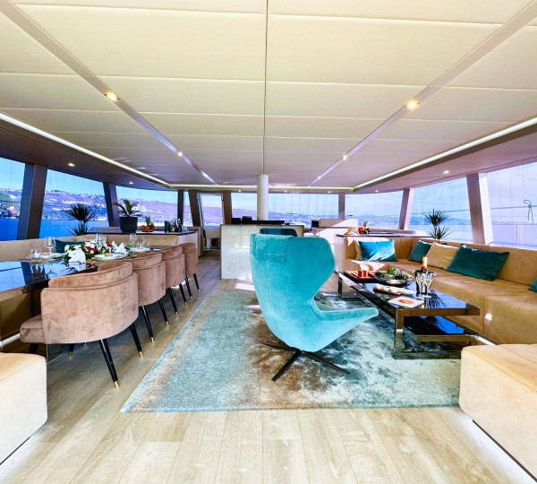 As well as offering elevated views of the surroundings, there is a forward helm station a row of sunpads on the starboard aft and a C-shaped seating area along the stern, shaded by a hardtop cover and complete with table for ...