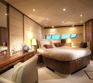 The Master suite is positioned on the main deck forward and is accessed via a corridor to port off the formal dining area.