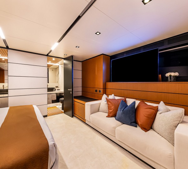 The yacht interior is relaxing, with a contemporary atmosphere, featuring traditional warm woods and neutral furnishings.