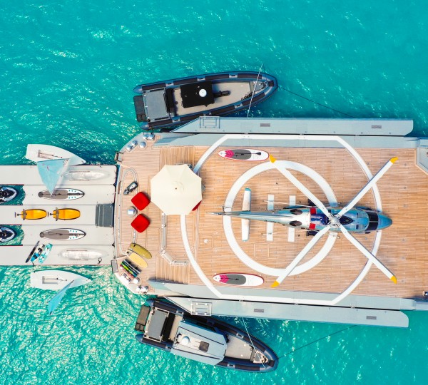 An aft stairway leads up to the cockpit, and a second stairway descends to the port side crew cabin and the starboard galley. The stern contains the tender and water toys.