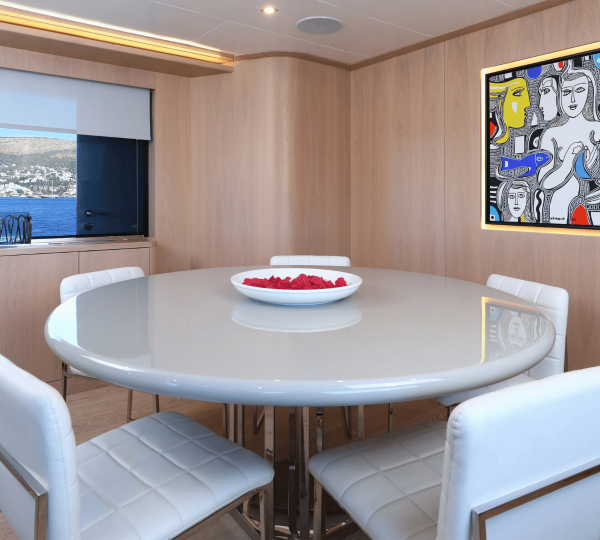 The space has an alfresco dining table with movable chairs, and the stern is fitted with a sumptuous sunbed for a rest in the warmth after a meal.