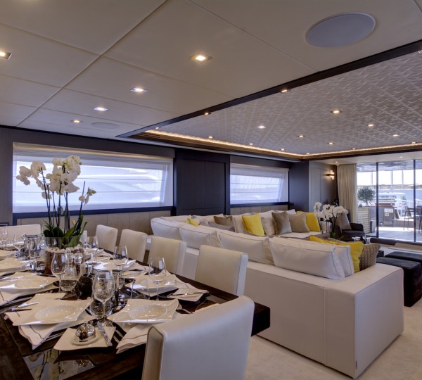 The sociable flybridge has lovely fitted and moveable furnishings including a u-shaped dining setting with bench seating, comfortable sun pads and bean bag style sun loungers.