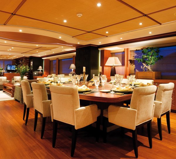 She has been designed with a spacious fly bridge including a 4-person jacuzzi and two corner sofas/dining settings, from where guests can enjoy the 360-degree panoramic views of the yacht's surroundings.