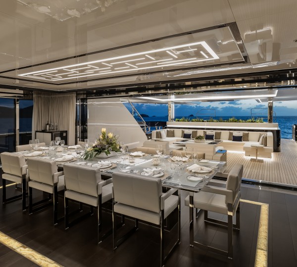 The salon and dining is laid in an open plan, with the spacious lounge forward and formal dining aft. Panoramic windows provide plenty of natural light and great views. The master stateroom is on the main deck, forward of the salon, while below decks is a VIP cabin, double cabin and 2 twin cabins.