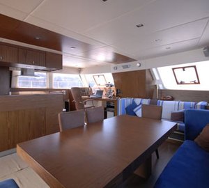 The salon and dining is an open plan, with the generous lounge aft and formal dining forward. Panoramic side windows allow ample natural light, to infuse the space and create an airy and spacious atmosphere.
