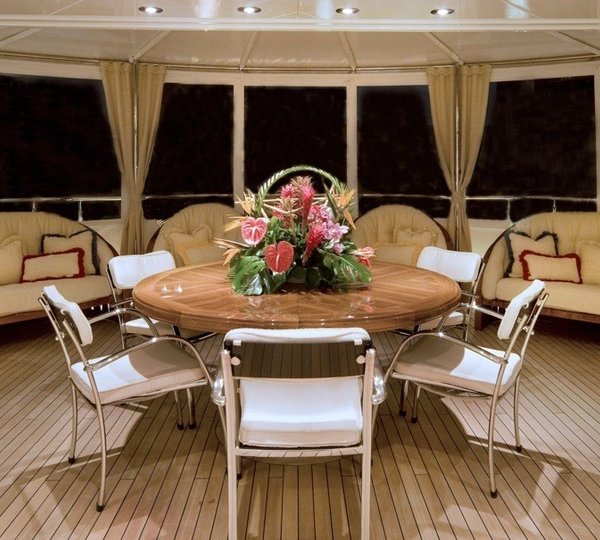 Wrap around decks lead to the M/Y SHARON LEE's spacious foredeck, complete with sunpads and circular built in seating.