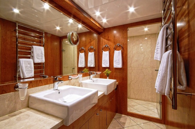For relaxation with family and friends, Annabel II yacht’s saloon features two comfortable sofas and opens out to the aft deck, which offers space for al-fresco dining to enjoy on those lovely Mediterranean summer nights. The woodwork applied throughout is a high gloss cherry wood.