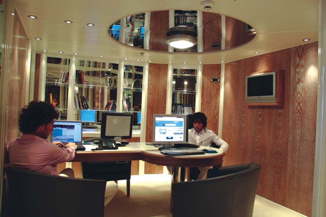 There is also a Business Centre set up in order to facilitate the business man. The computers, fax machine and printer are all for the guests’ use. Video conferencing is also available and an LCD screen can constantly transmit the news or stock markets via satellite TV. Internet is accessible from this centre but also from all areas of the yacht.