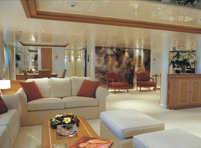 Effortlessly elegant, the Main Saloon exudes a sense of luxury, while simultaneously giving an informal atmosphere. The room is finished in light colour, thus emphasising the triptych painted by the renowned artist Katerina Georgantas that adorns one entire wall. Equipped with a boudoir grand piano, a games tables and a 55 inch plasma-screen television, it is indeed the ideal place to relax and perhaps indulge in an after-dinner aperitif.