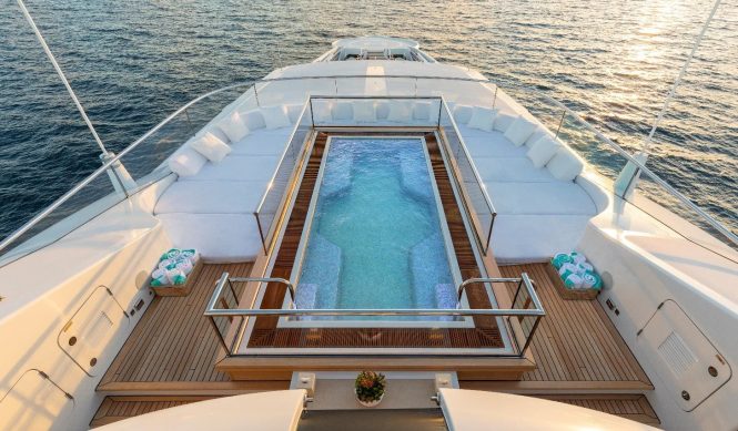 Guests can choose to arrive on board by helicopter to the foredeck helipad, before being welcomed by the crew to sample the other delights on offer. Given her size, it is no surprise to find a choice of deck spaces across her three levels. The sun deck is open and sociable, allowing guests to sunbathe, dine or take a dip in the swimming pool. Further al fresco dining and lounge options can be found on the bridge and main decks before exploring the interior spaces.