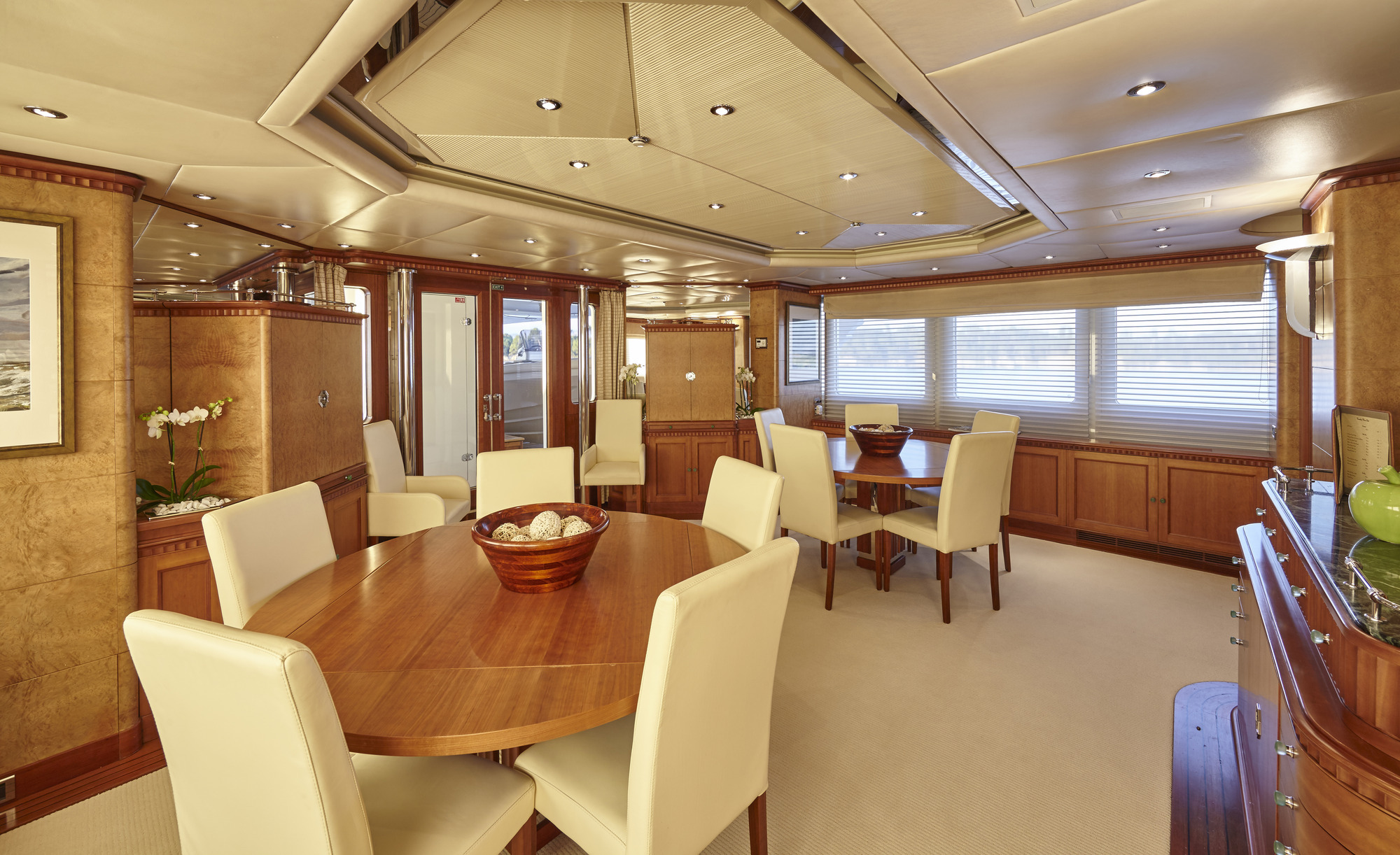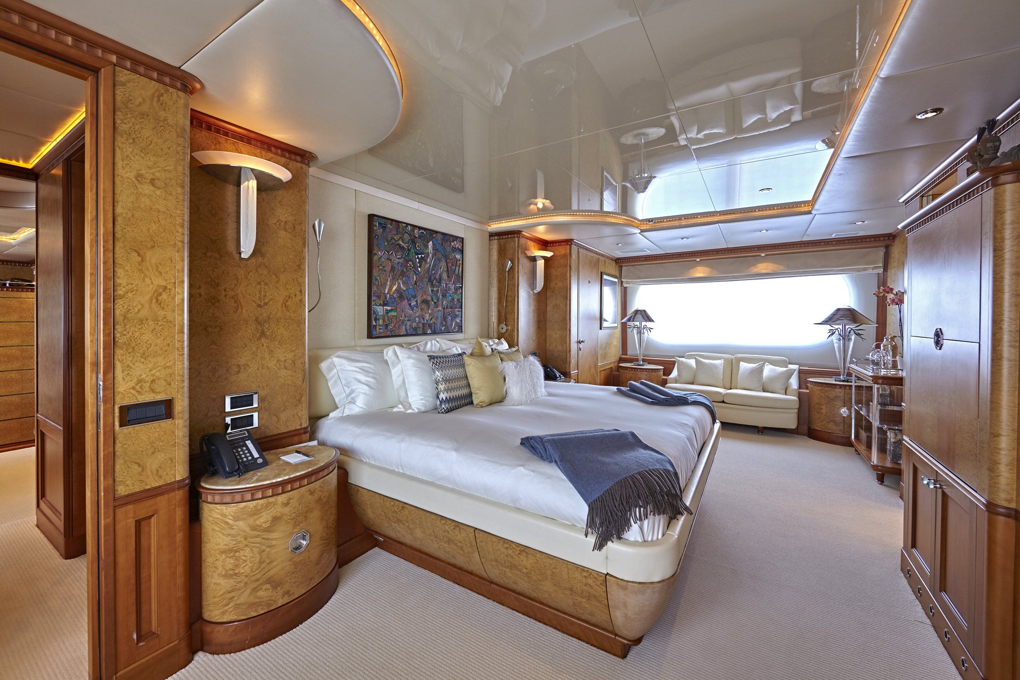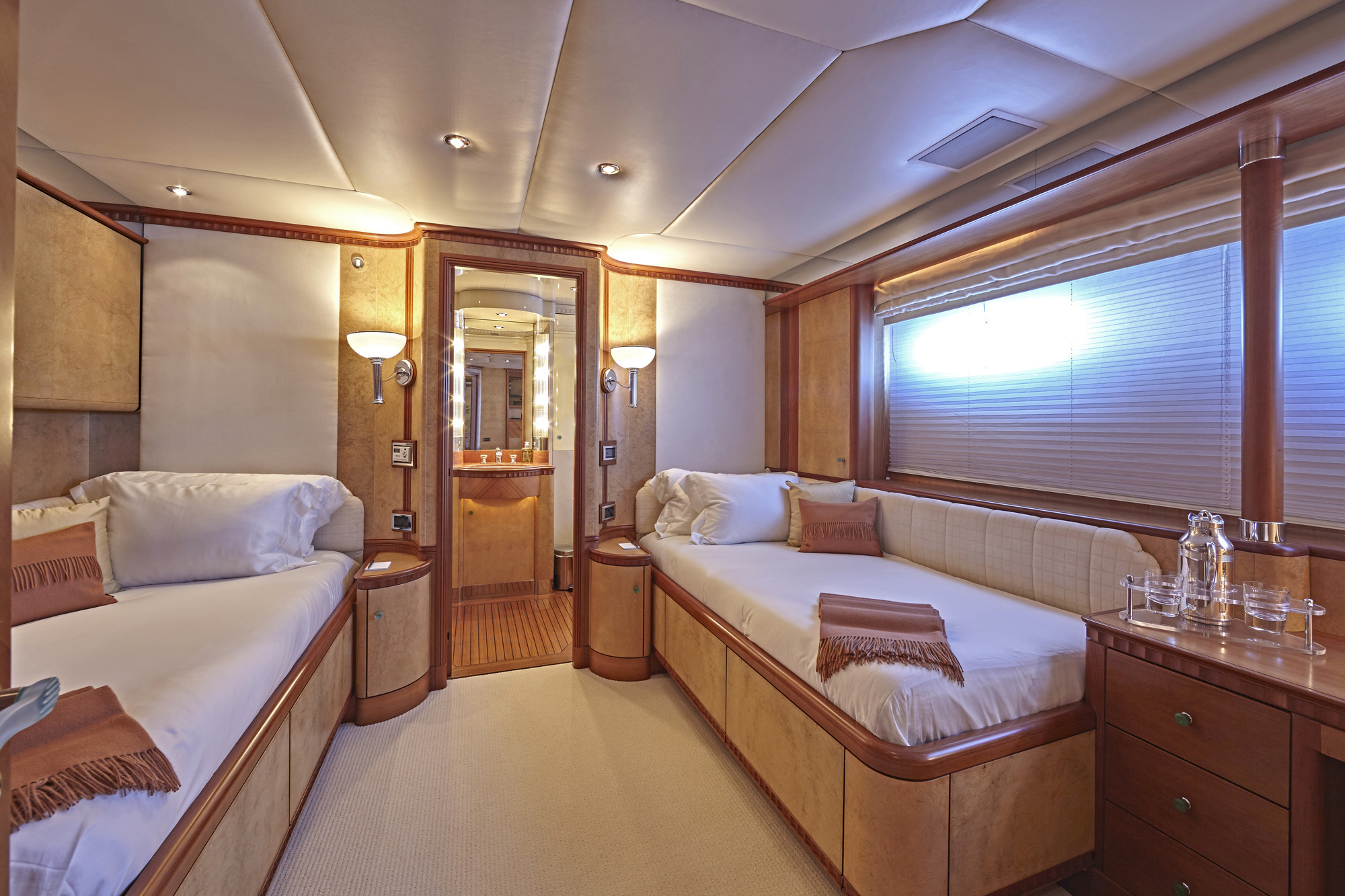 LADY ELLEN II has accommodations for 10-12 guests in 6 beautiful Zuretti designed cabins spread over 3 decks. Her full width master cabin with a king size bed offers good views on both sides, and with no side decks forward, maintains privacy. Also on the main deck is a smaller double cabin with ensuite shower room. Her full width VIP stateroom with a king size bed on the lower deck has separate bath and shower rooms, which along with two twin cabins and an upper deck single provides accommodations for 10-12 guests. Berth sizes: Master stateroom King:6.9'L x 6.9'W VIP stateroom King: 6.5'L x 5.10'W Twin staterooms: 6.6'L x 3.4'W Ceiling height throughout yacht: 6.8'.