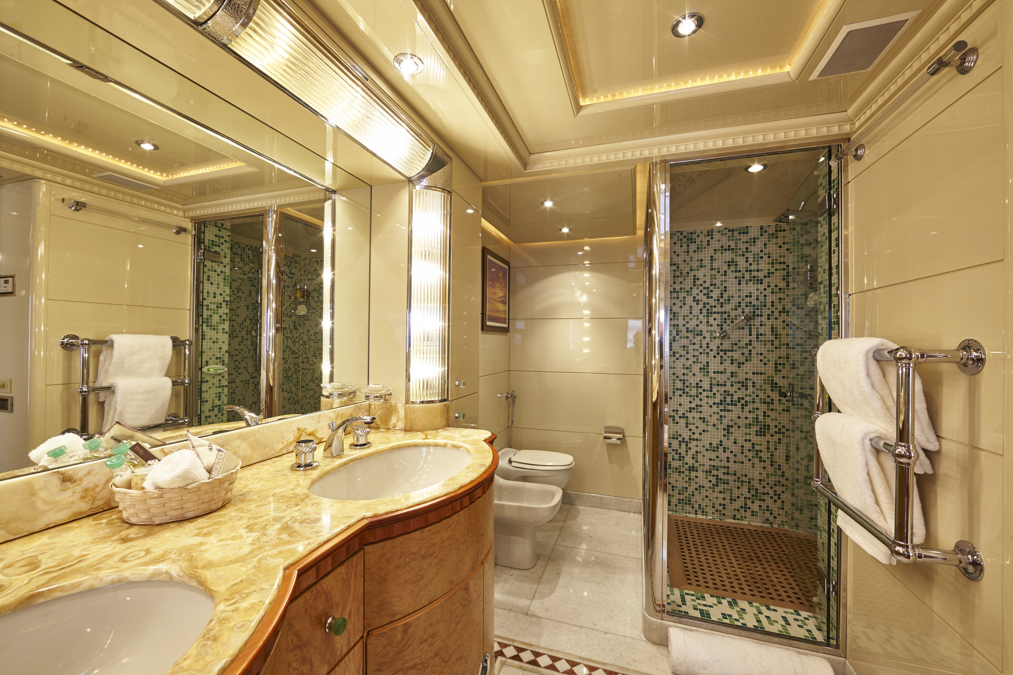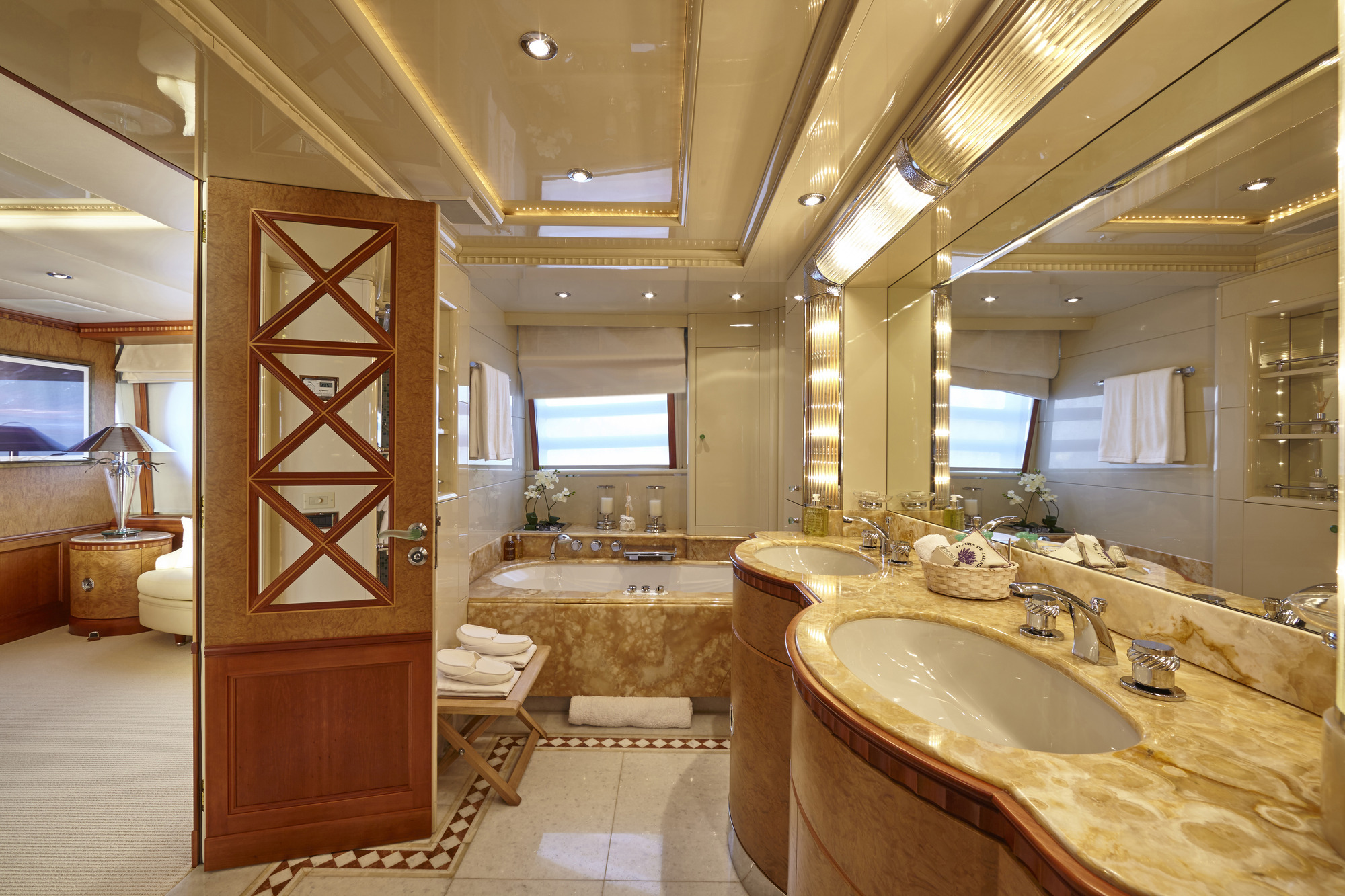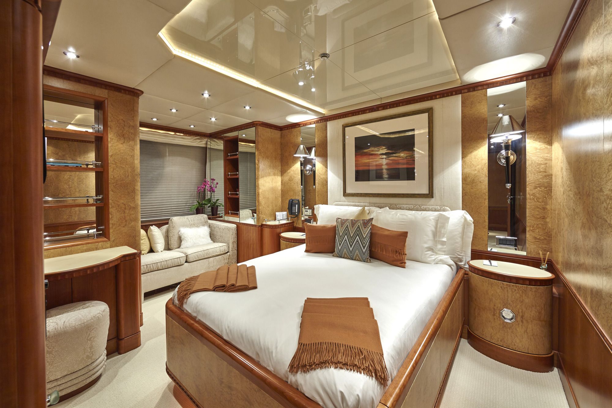 LADY ELLEN II has accommodations for 10-12 guests in 6 beautiful Zuretti designed cabins spread over 3 decks. Her full width master cabin with a king size bed offers good views on both sides, and with no side decks forward, maintains privacy. Also on the main deck is a smaller double cabin with ensuite shower room. Her full width VIP stateroom with a king size bed on the lower deck has separate bath and shower rooms, which along with two twin cabins and an upper deck single provides accommodations for 10-12 guests. Berth sizes: Master stateroom King:6.9'L x 6.9'W VIP stateroom King: 6.5'L x 5.10'W Twin staterooms: 6.6'L x 3.4'W Ceiling height throughout yacht: 6.8'.