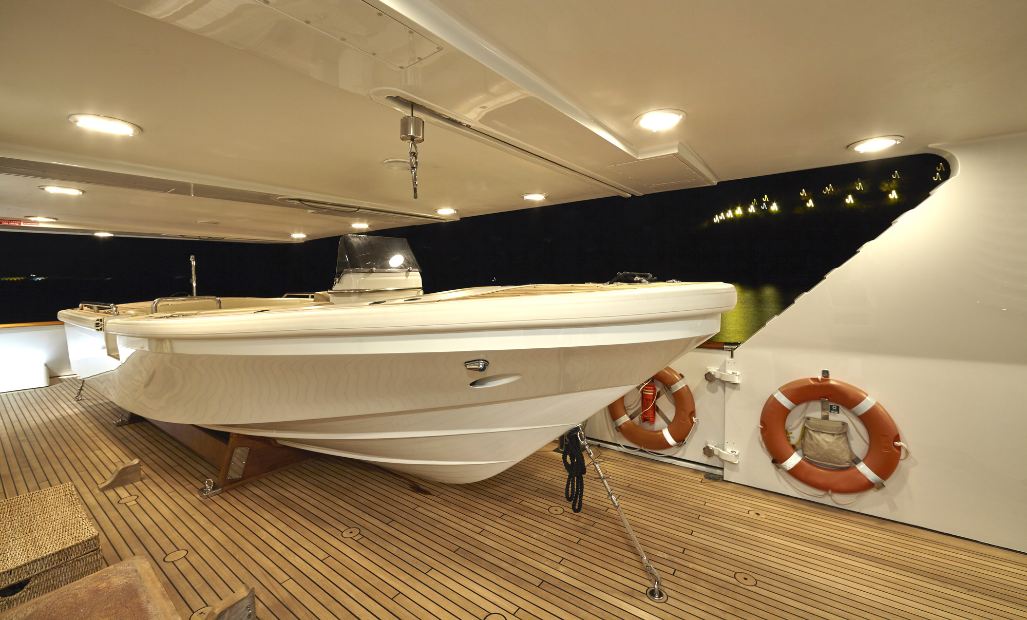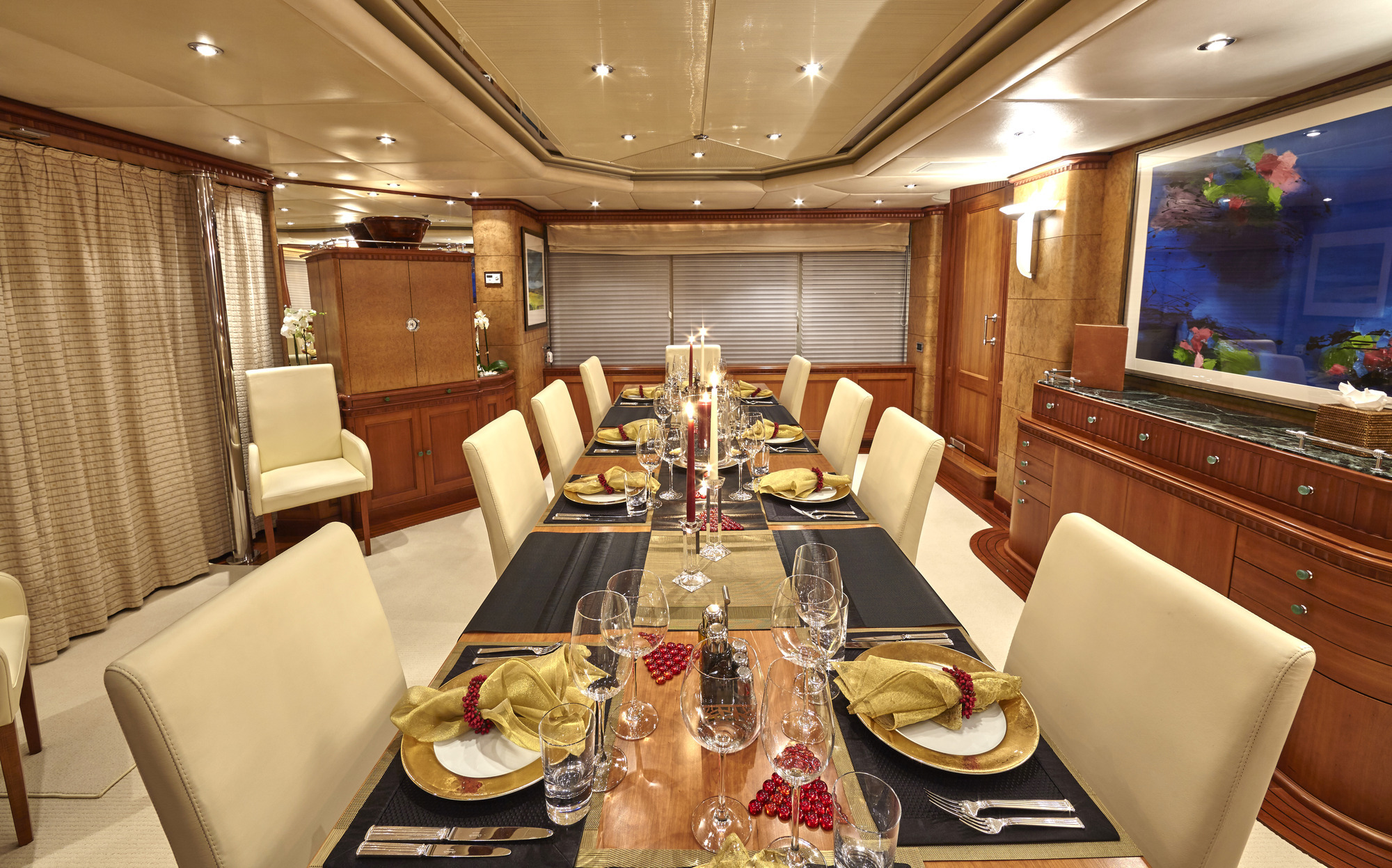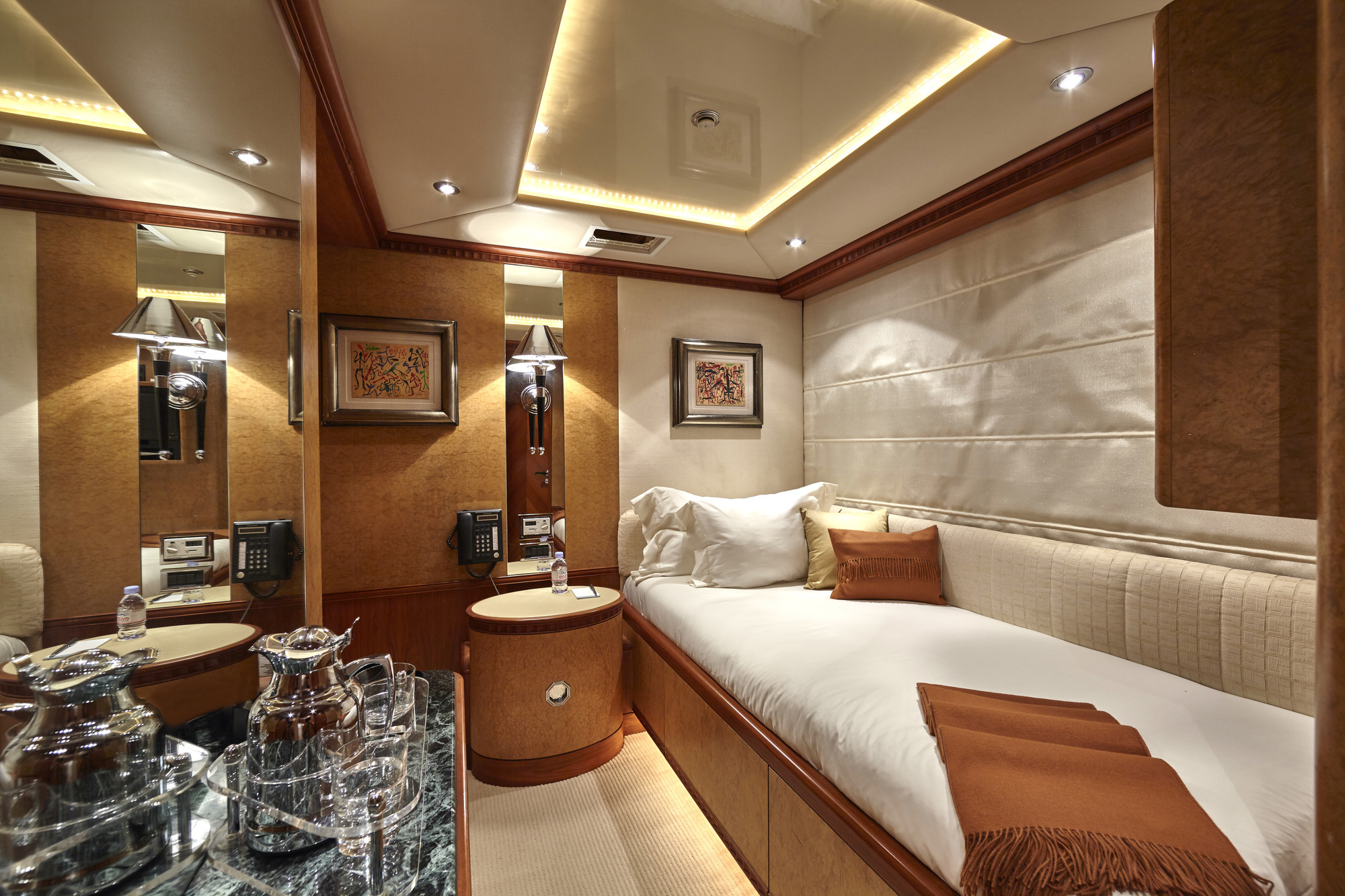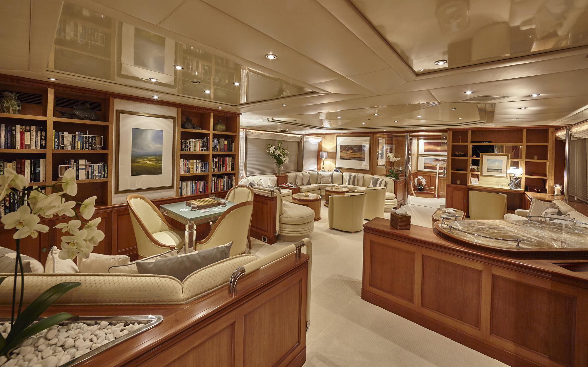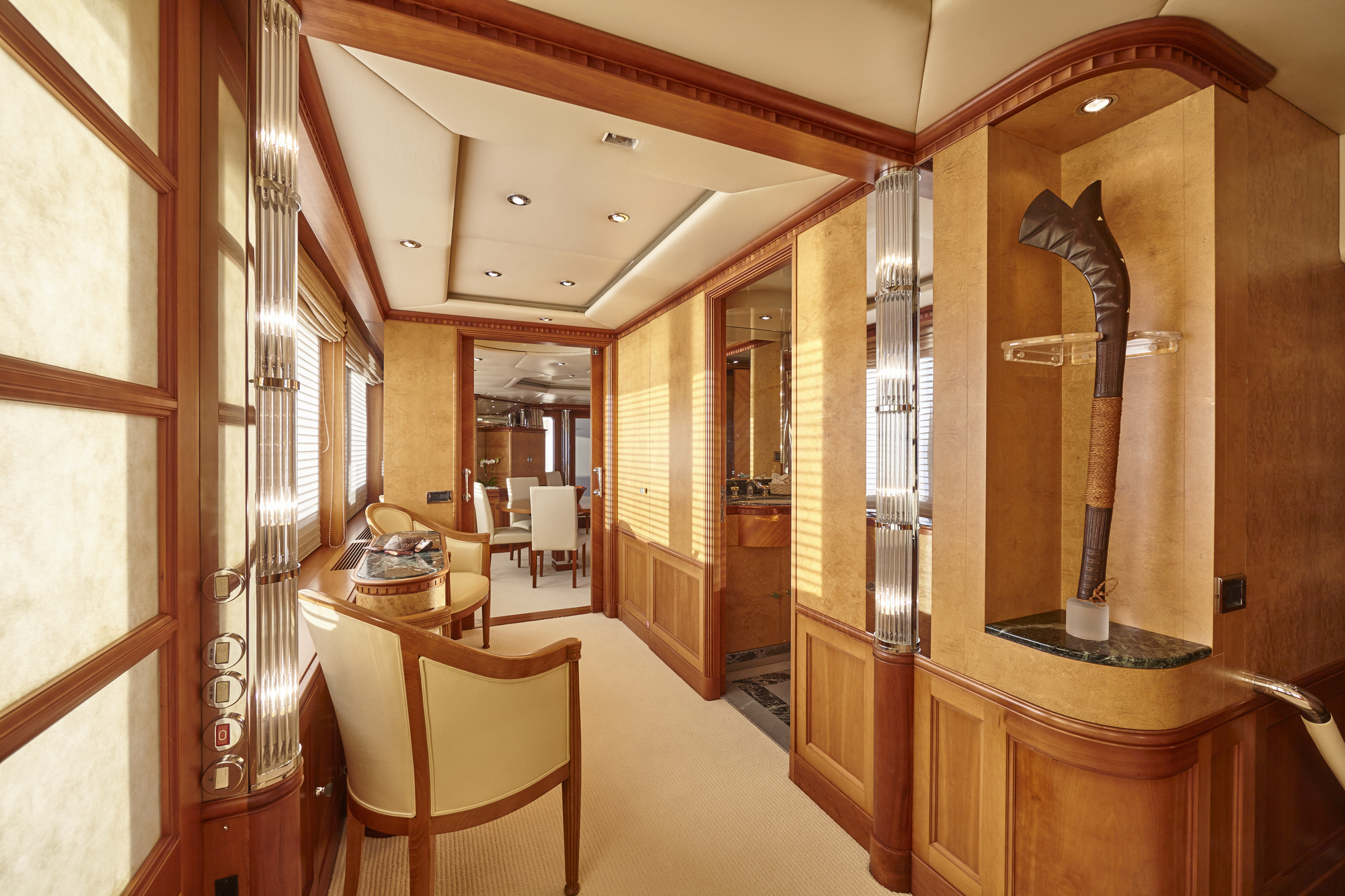 The luxury charter yacht features a generous salon on the upper deck, offering ample seating, sofas, coffee tables and games tables. On the lower deck is the formal dining area aft and full beam master stateroom with private study forward. On the port side main deck is a guest cabin with double bed. She boasts a single cabin on the upper deck. On the lower deck is the full beam VIP cabin, with study and sofa, plus 2 spacious twin cabins. All guest cabins are light, contemporary and offer private en-suite facilities.