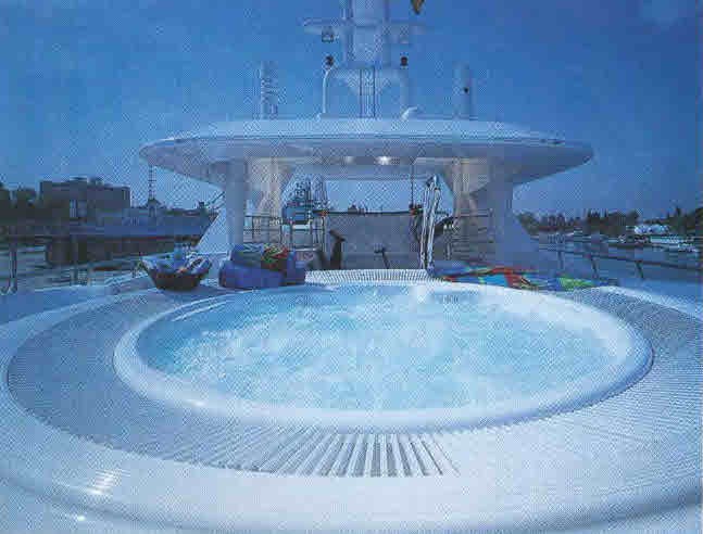 The yacht's wider design collaboration came from De Voogt Naval Architects. The technical naval architecture drawings are the work of De Voogt Naval Architects. Motor Yacht KISSES received her elegant interior designing from the interior design company of George Larson/Robert Knack. the Netherlands is the country that The Feadship De Vries Shipyard built their new build motor yacht in. After the formal launch in 2000 in Aalsmeer the boat was thereafter delivered on to the yacht owner having completed final finishing. The main hull was built out of steel. The motor yacht superstructure is made extensively with aluminium. With a beam of 9.81 metres / 32.2 ft KISSES has fairly large interior. A fairly deep draught of 3m (9.8ft) limits the amount of overall ports she can enter into, depending on their particular depth at low tide. She had refit improvement and modification completed by 2008.