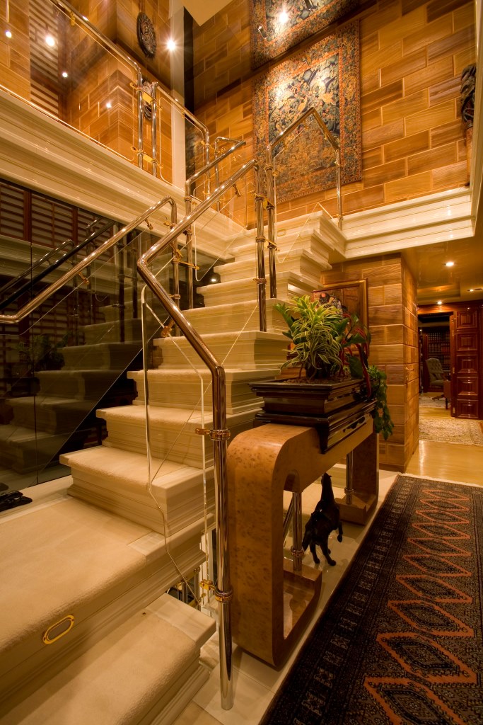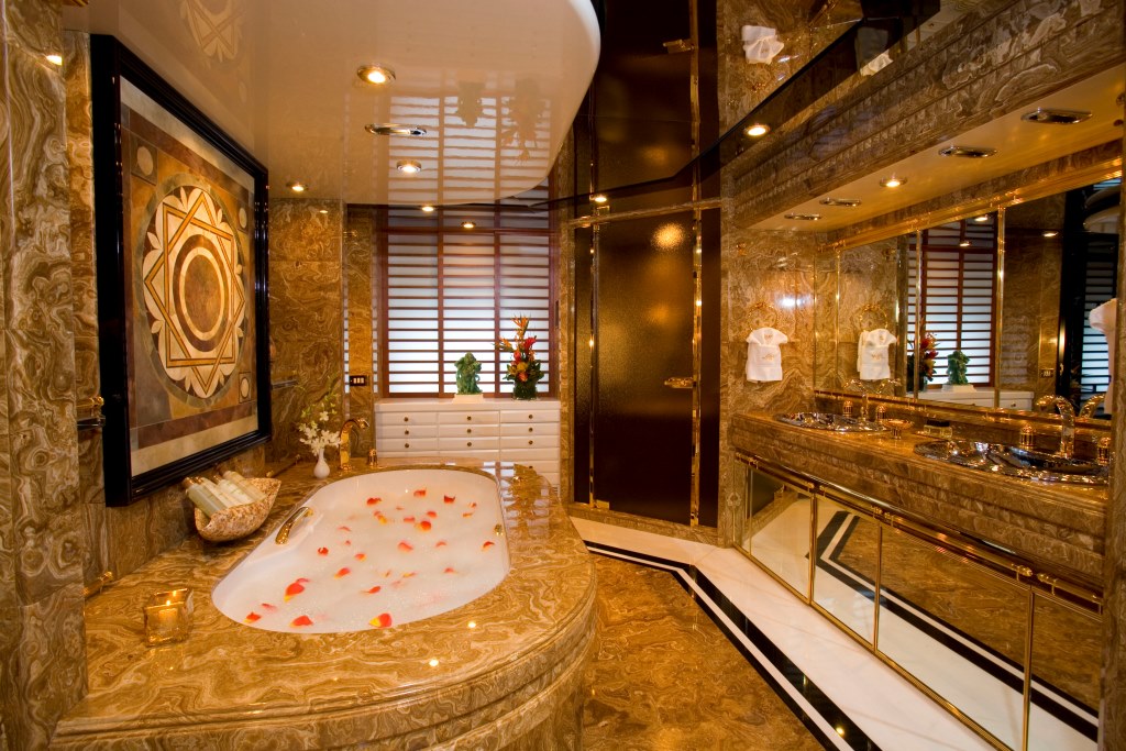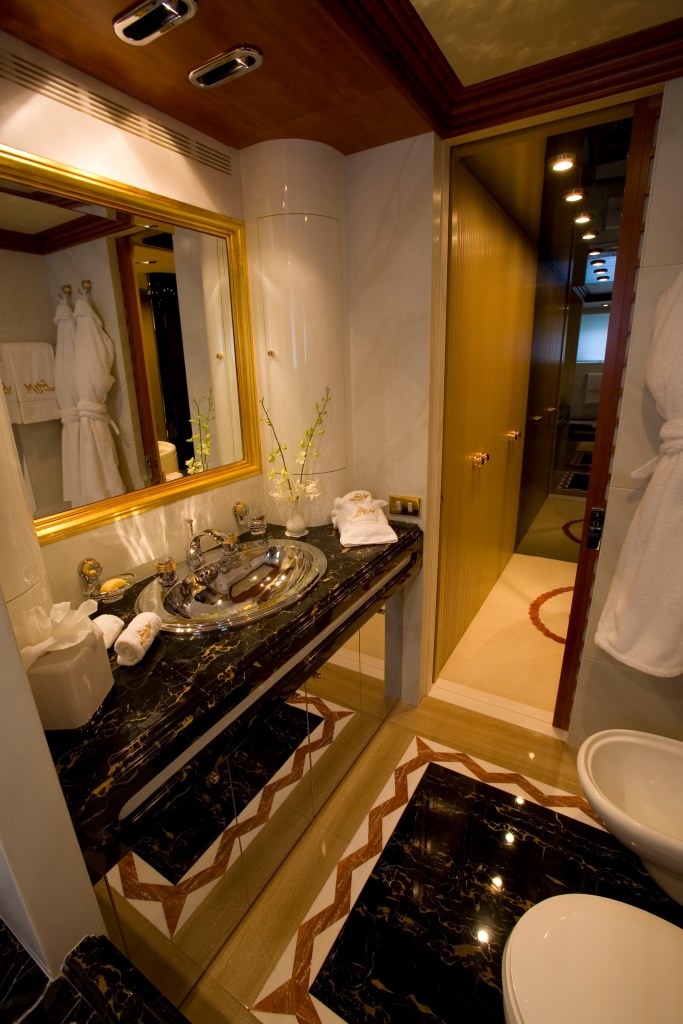 Luxury motor yacht LADY M II has a unique layout with five double cabins. This layout can also be converted to provide a full width master stateroom, a spacious VIP with his & hers bathrooms & 2 further identical double cabins. The full width master on the main deck has an adjoining study/ lounge and the master bathroom is finished in honey-grained marble. The VIP stateroom has an adjoining lounge with separate en suite facilities that can easily be converted into two comfortable doubles. Further aft and adjoining the central lobby on the lower deck can be found the two remaining mirror image doubles, both finished with the same commitment to quality as the owner’s suite. There is also the possibility of one further single cabin which can be used for staff.