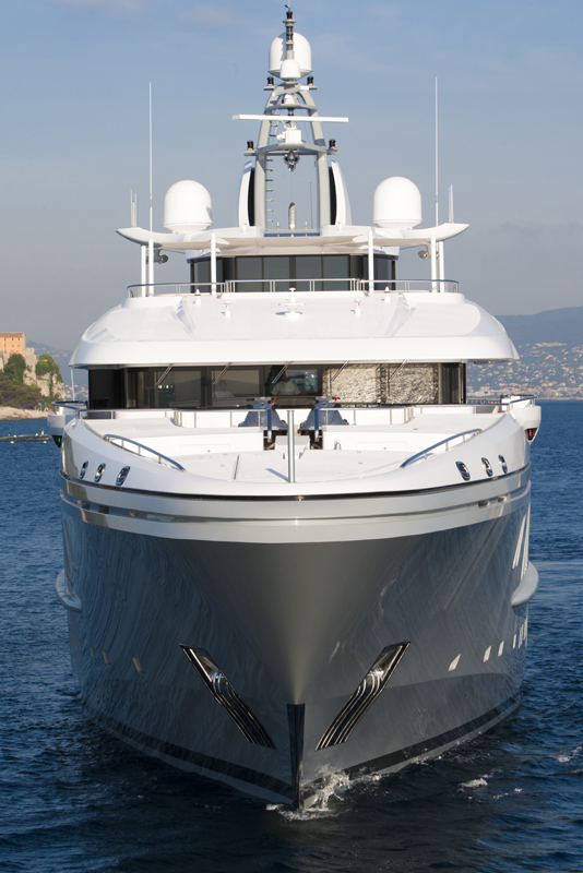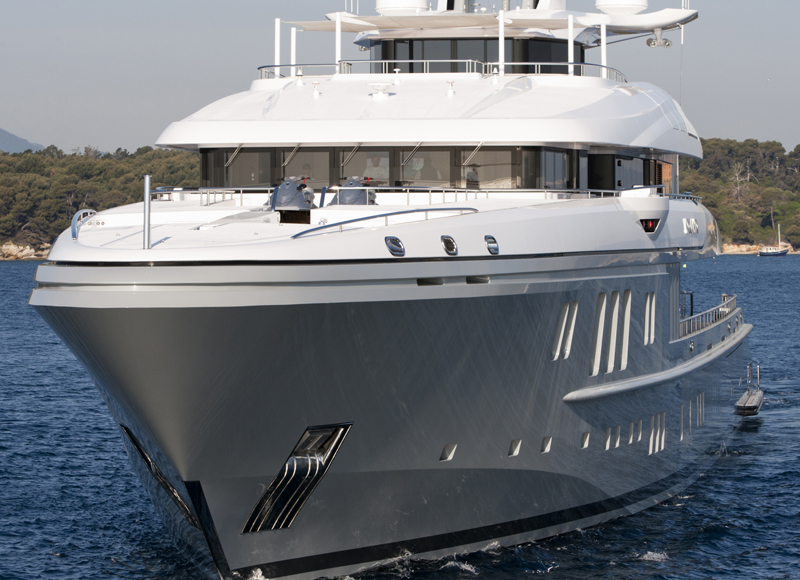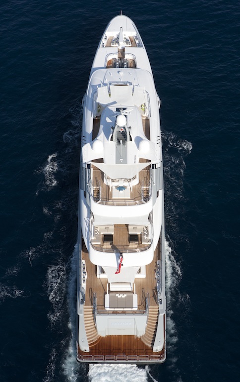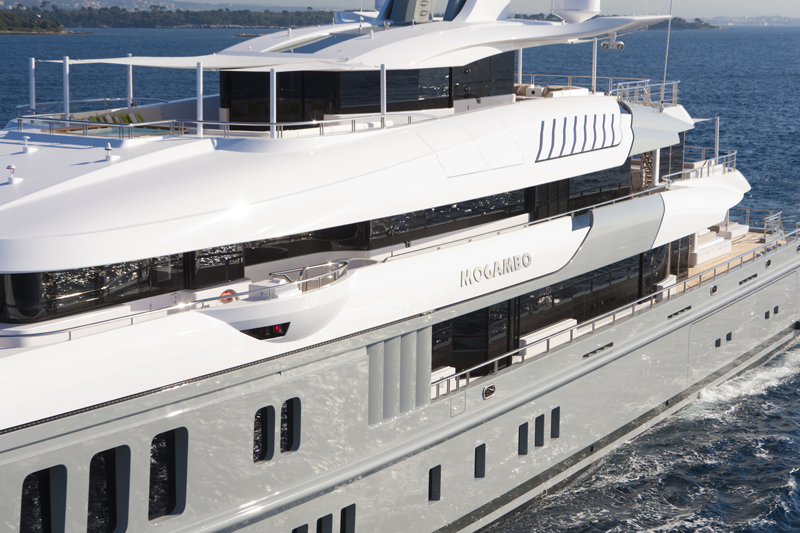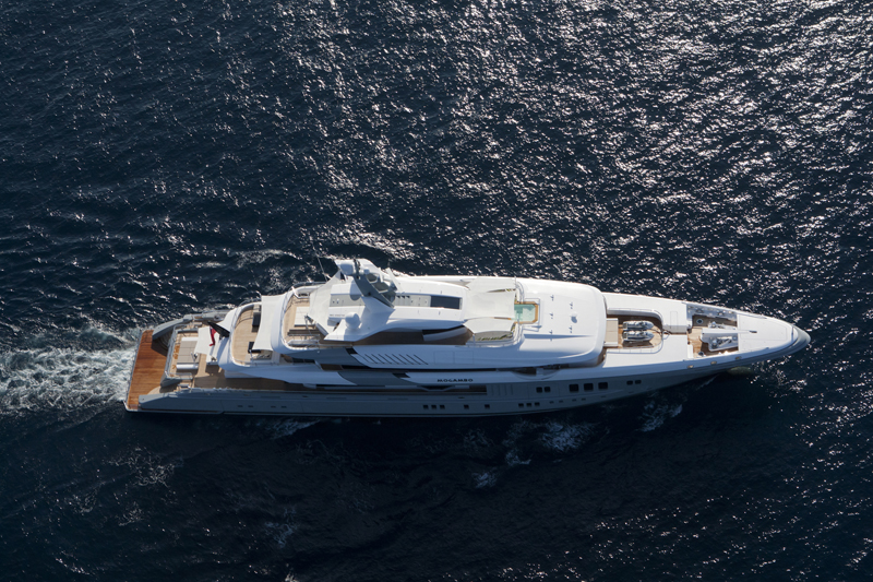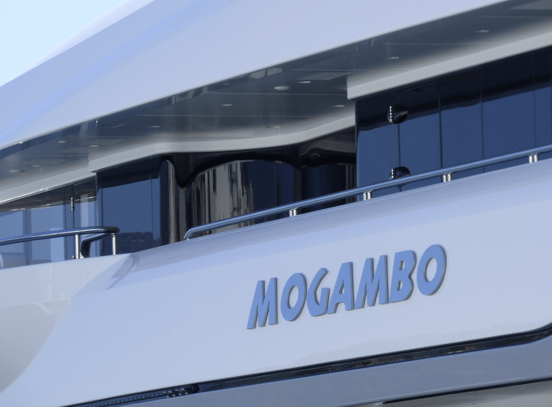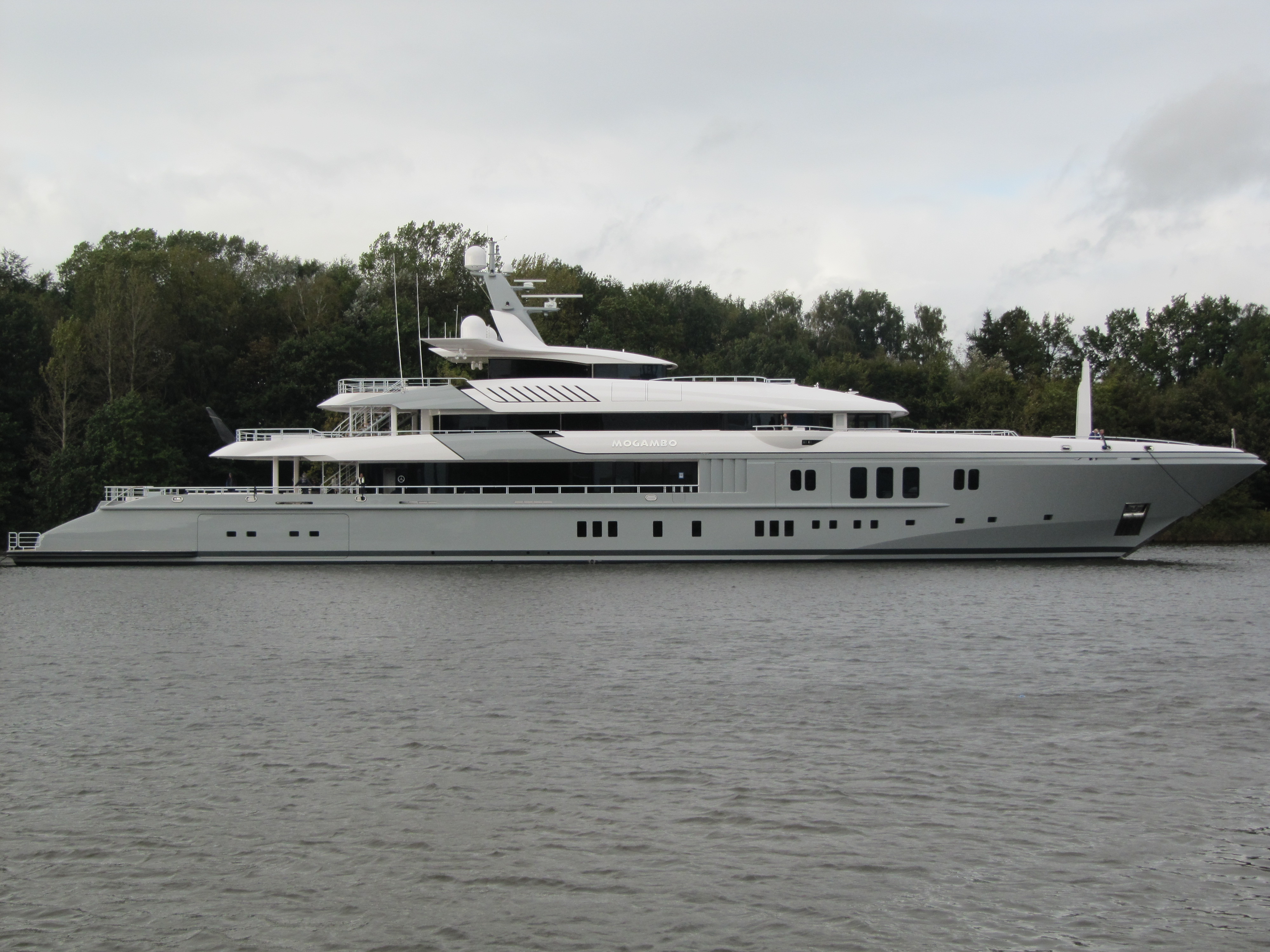 Luxury yacht MOGAMBO (hull 782) has a beam of 12 meters (39.4ft), a draft of almost 3.55 meters (12ft) and is powered by twin 2,360hp MTU 16V 4000 M60 diesel engines. Mogambo superyacht cruises at 14.5 knots reaching a maximum speed of 17 knots.
