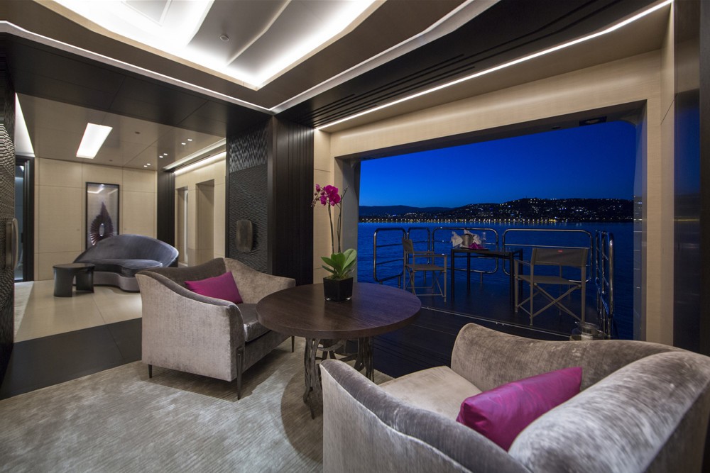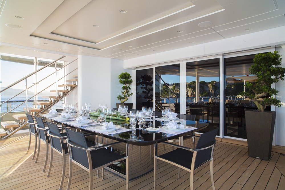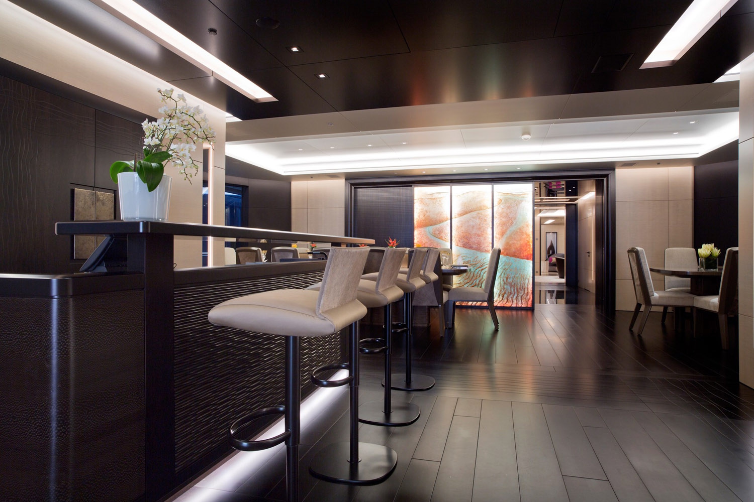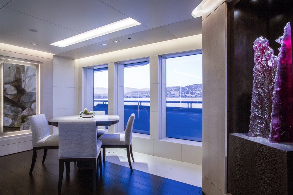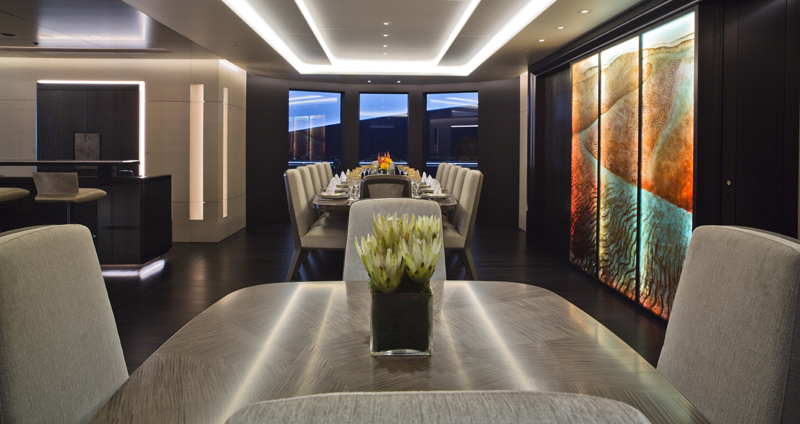 The dining area and salon areon the main deck, offering plenty of space for formal dining, lounging and socializing. Ebonized walnut floors and sycamore wood paneling create a sophisticated and calm ambiance. Twelve guests can dine in style ay the large table located further away from the seating area.