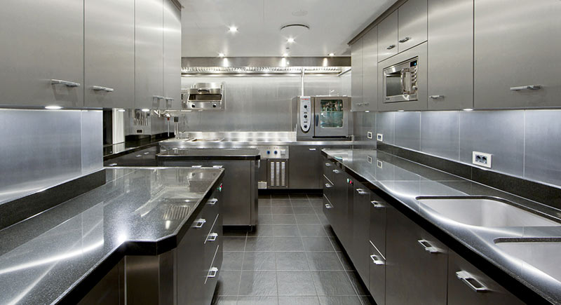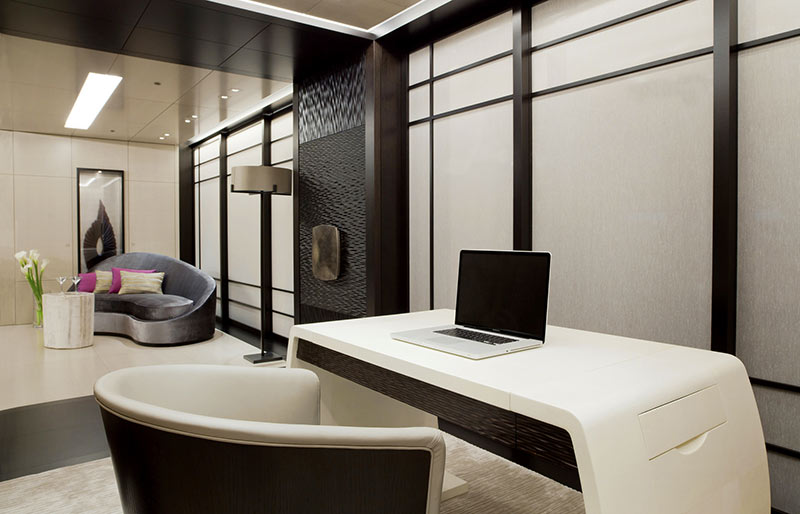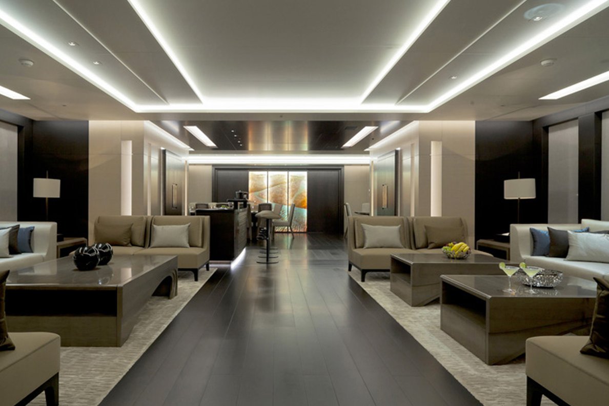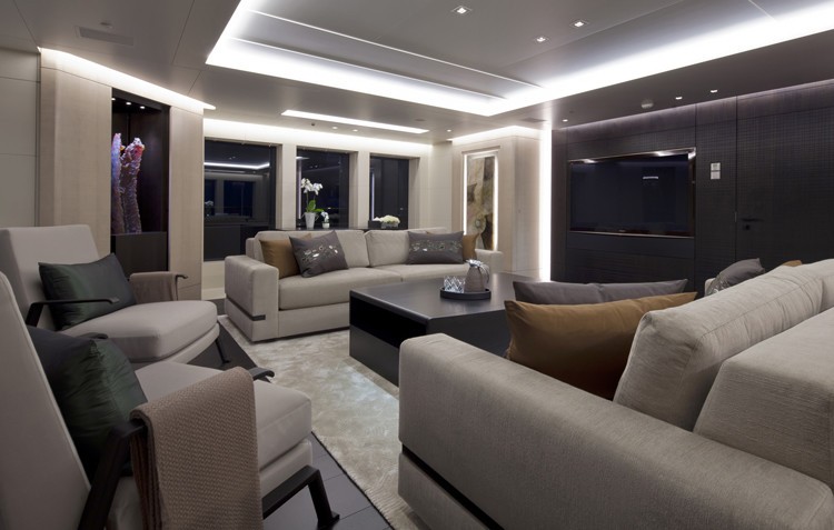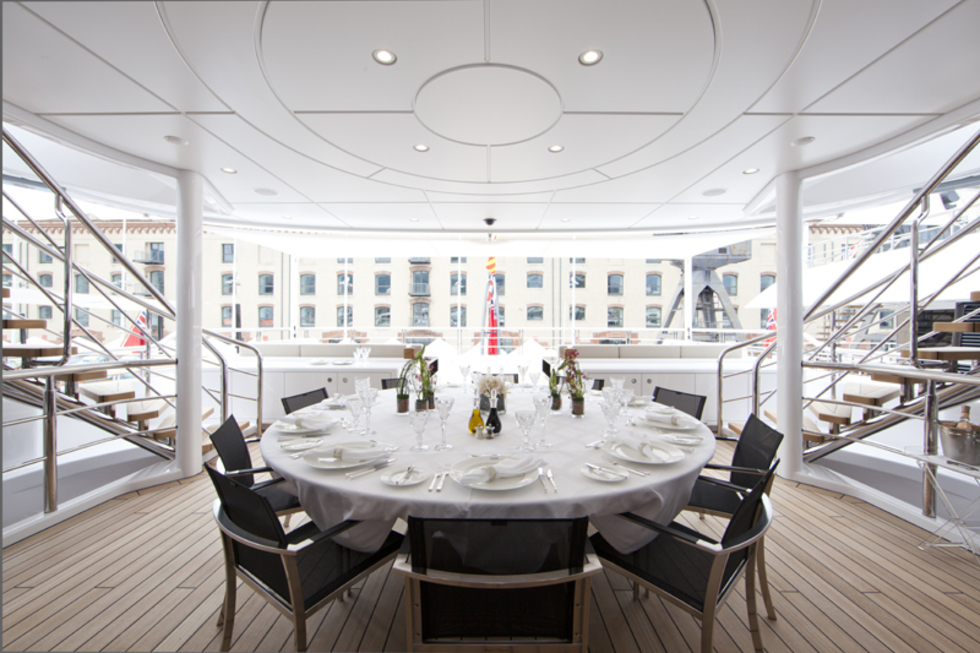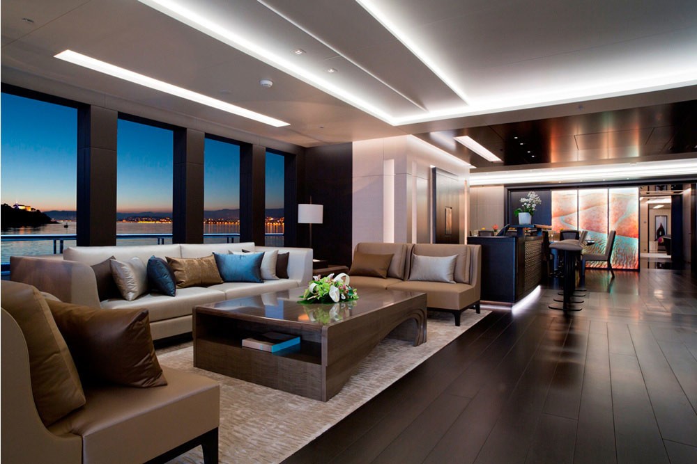 The dining area and salon areon the main deck, offering plenty of space for formal dining, lounging and socializing. Ebonized walnut floors and sycamore wood paneling create a sophisticated and calm ambiance. Twelve guests can dine in style ay the large table located further away from the seating area.