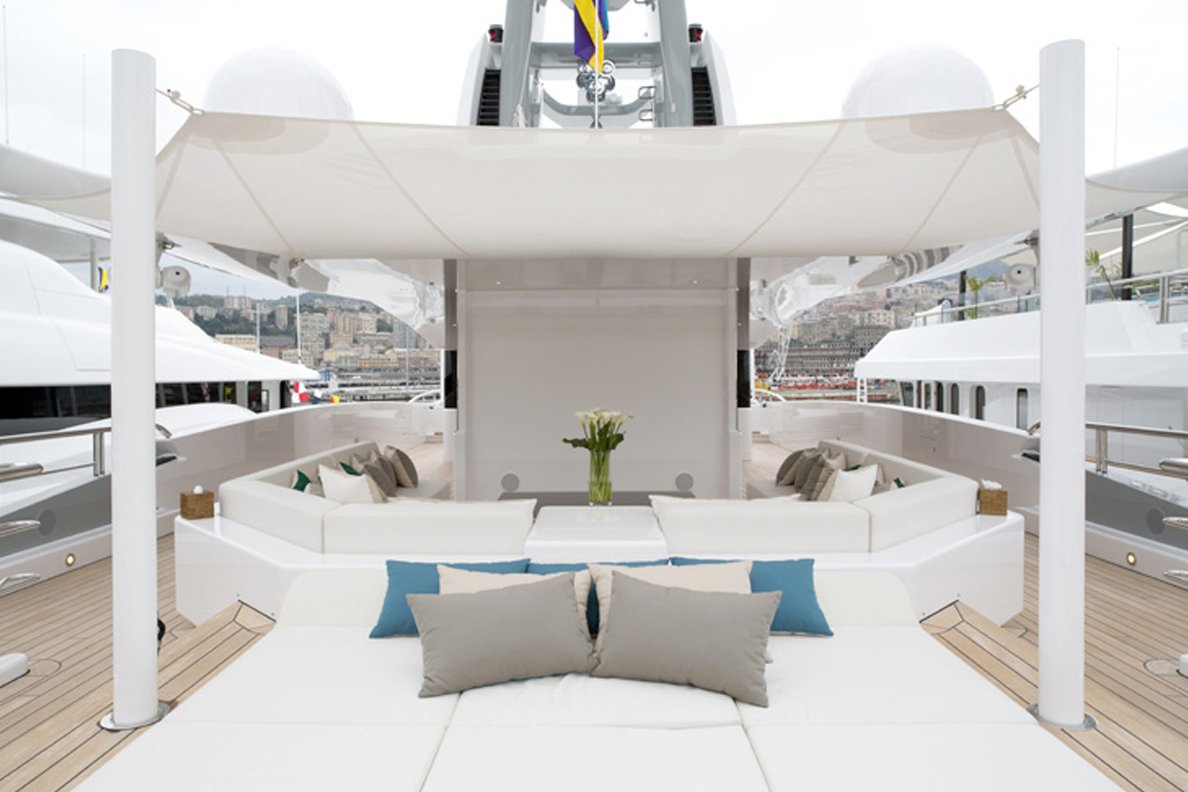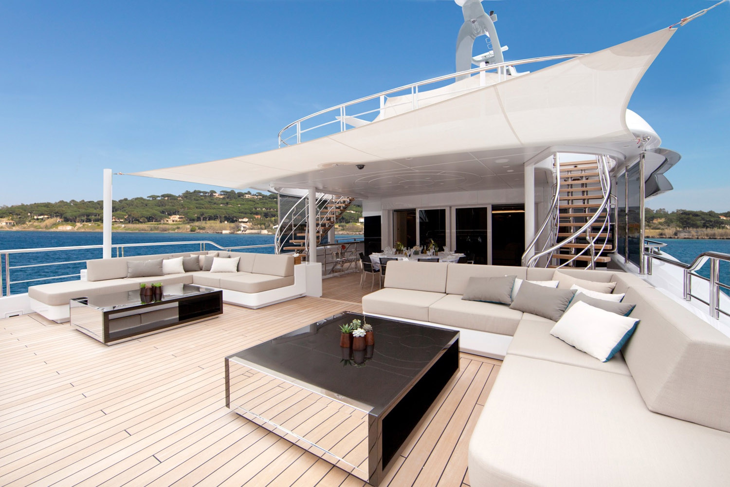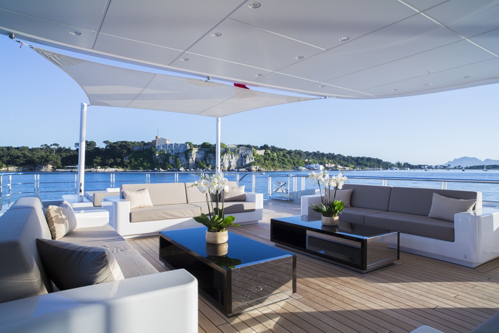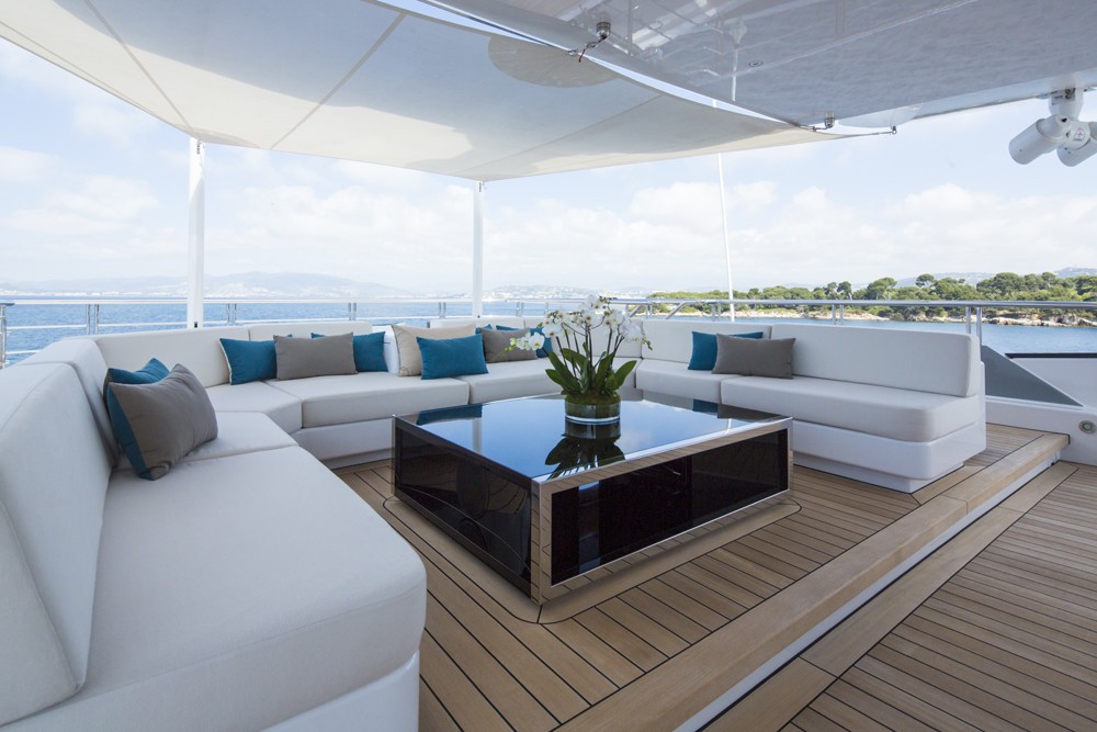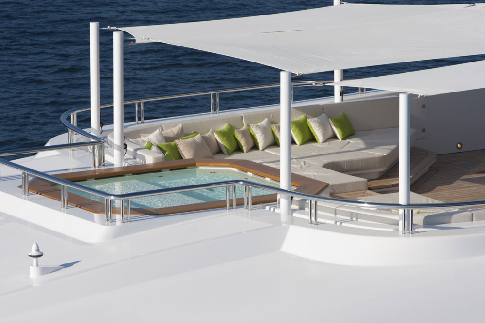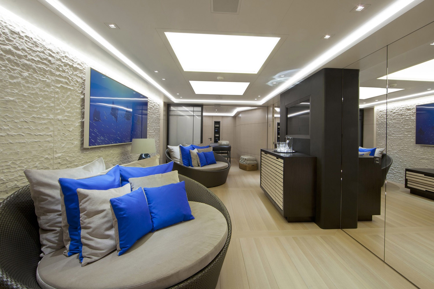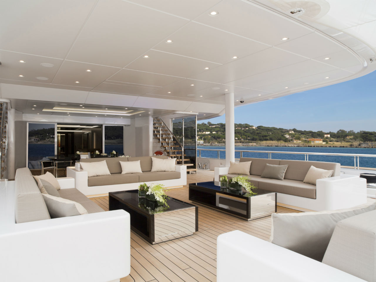 The beach club boasts massage room, sauna and steam room, beauty salon and lounge. Sunbathing, swimming and relaxation are the key activities when it comes to luxury lifestyle aboard MOGAMBO. The large pool is partially shaded with a sunbathing/seating area located on the main deck aft. The exterior living spaces also offer great alfresco dining table, plush seating, and sun loungers. The sundeck is ideal for worshiping the sun and having some quiet time.
