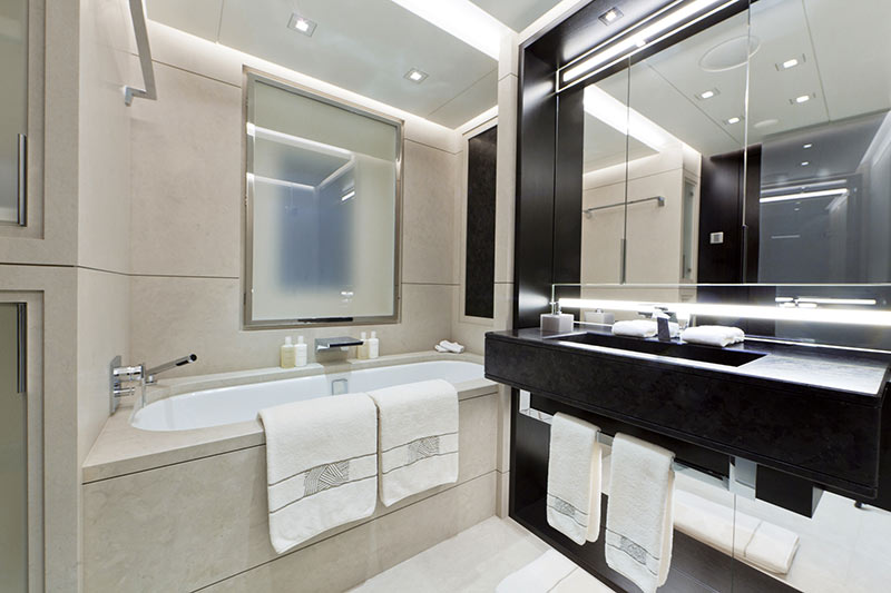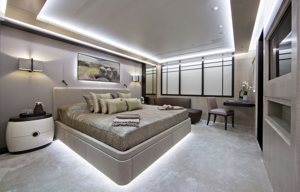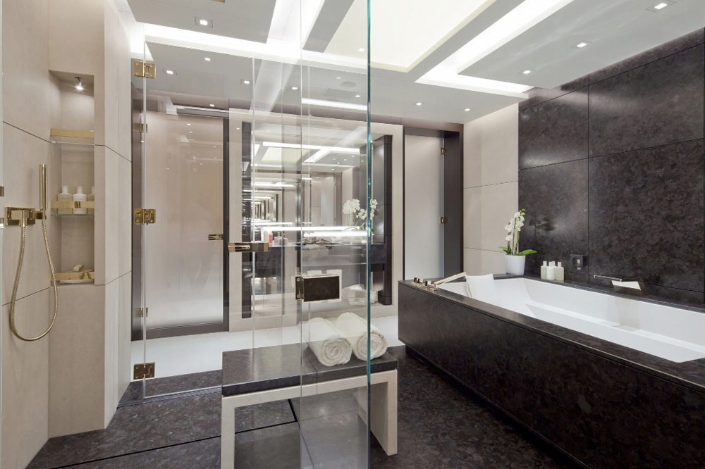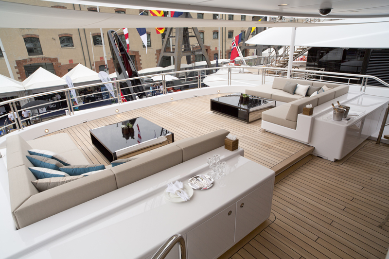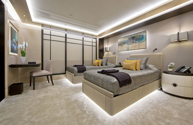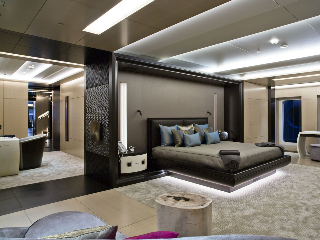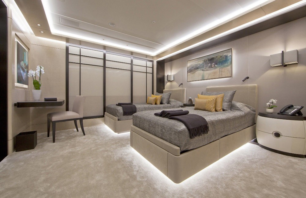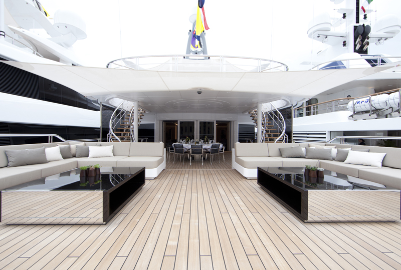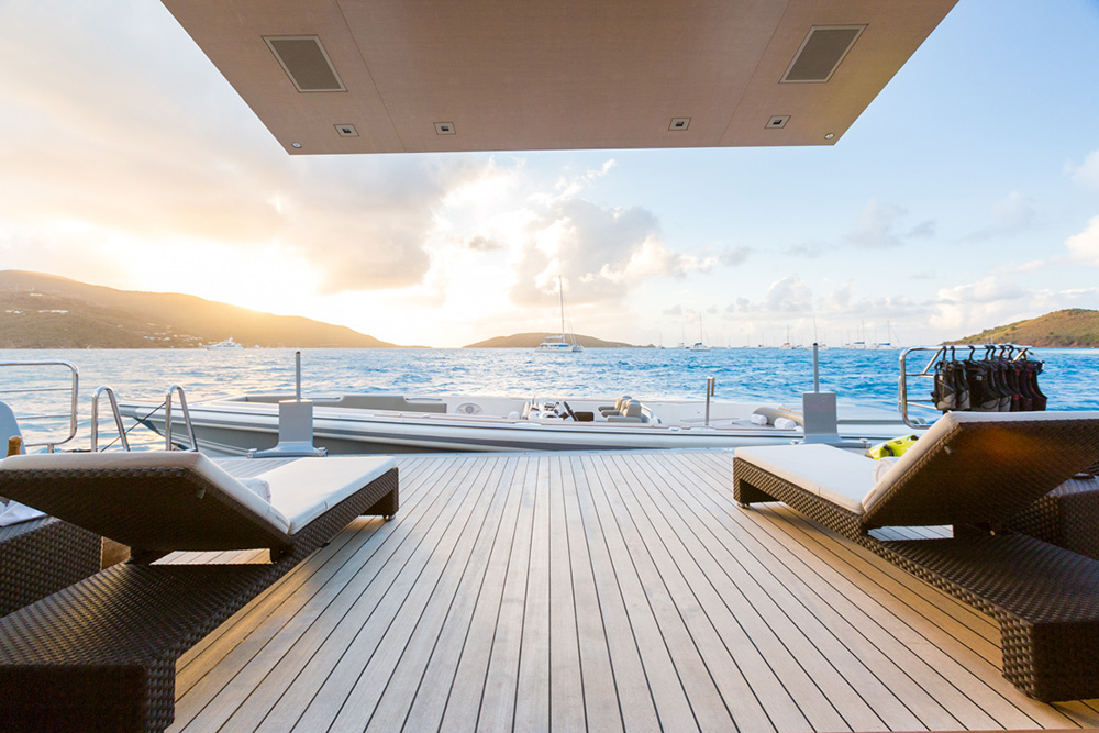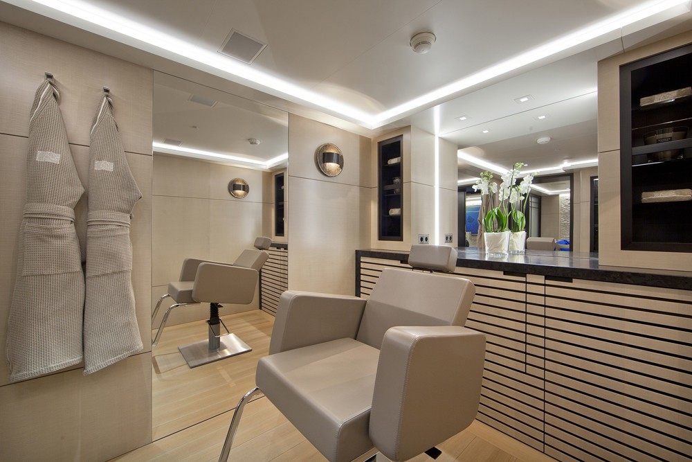 The beach club boasts massage room, sauna and steam room, beauty salon and lounge. Sunbathing, swimming and relaxation are the key activities when it comes to luxury lifestyle aboard MOGAMBO. The large pool is partially shaded with a sunbathing/seating area located on the main deck aft. The exterior living spaces also offer great alfresco dining table, plush seating, and sun loungers. The sundeck is ideal for worshiping the sun and having some quiet time.