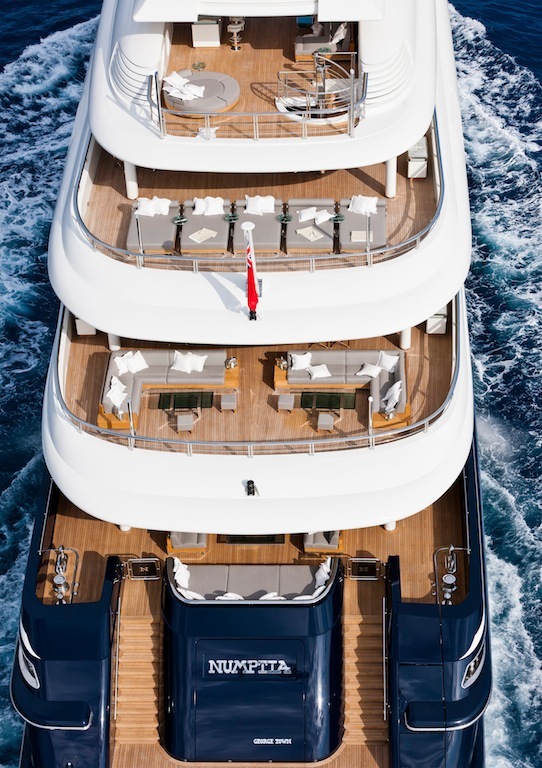 Design Studio Spadolini: "The superyacht yacht Numptia has been designed with a very exhaustive brief from the client. All details for the external part of the yacht build has been studied with the client and yacht owner and always in accordance with his specific requests. Smooth inside/outside communication, in the formal and guess area, with large glass sliding floor to ceiling doors (every thing according to rules). An other special feature can be found in all the service crew passage ways that are studied for the extensive use of industrial food troleis.