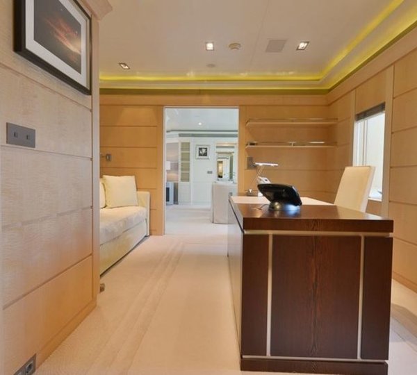The owner’s suite is highly innovative and comprises a separate office/library with a hidden fold-out bed that turns into an extra cabin when needed. The suite also hosts a hidden security closet and his and hers dressing areas that are connected by an immense bath carved from Portuguese marble.