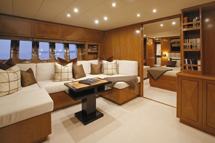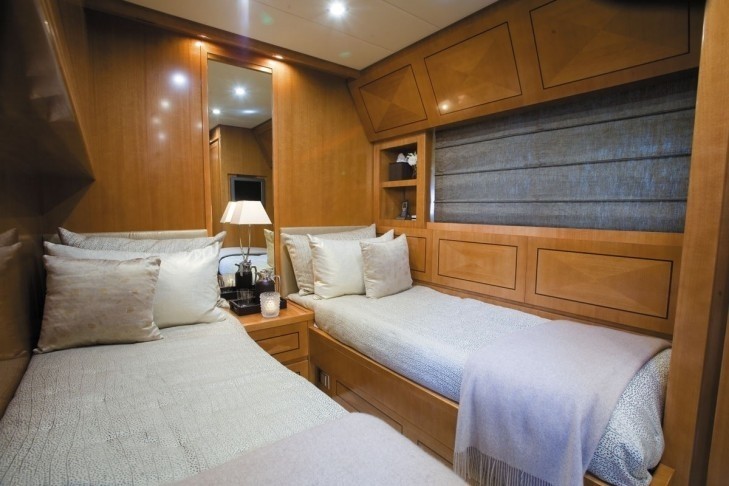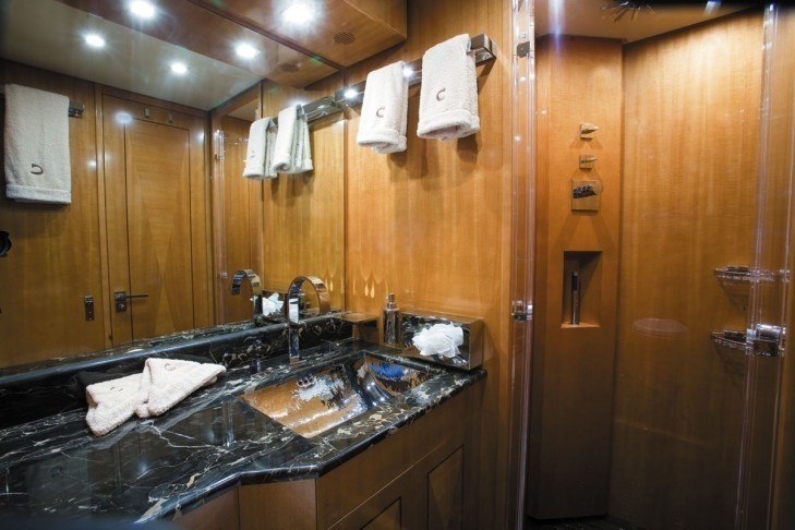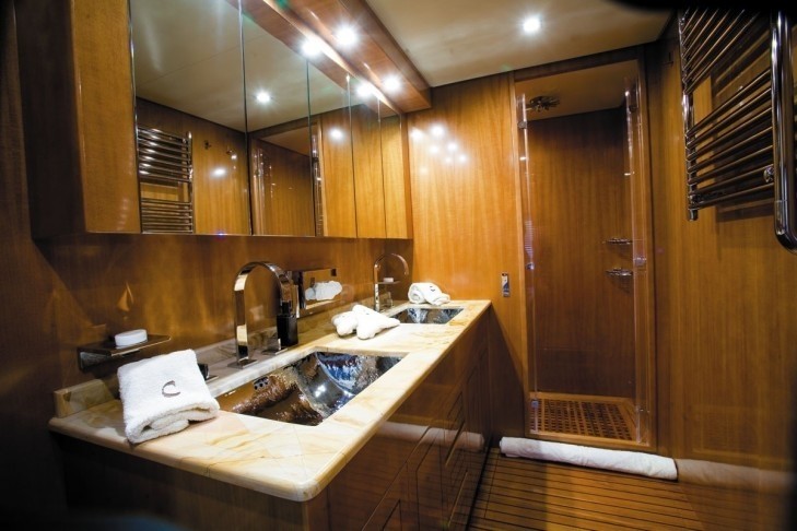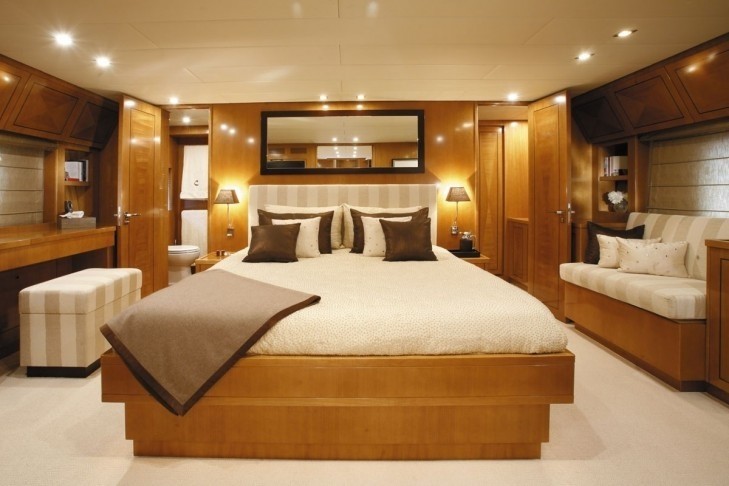 Fast cruising Leopard Motor Yacht CARAMIA comfortably accommodates 6 guests in 3 spacious cabins. The master cabins is equipped with a king sized bed, private ensuite and entertainment and music systems. The remaining two cabins are both twin cabins with two single beds in each, private ensuite and music system including ipod docking stations. Each twin cabin is also equipped with a Pullman bed to sleep up to 8 in total. These are mainly suitable for children.