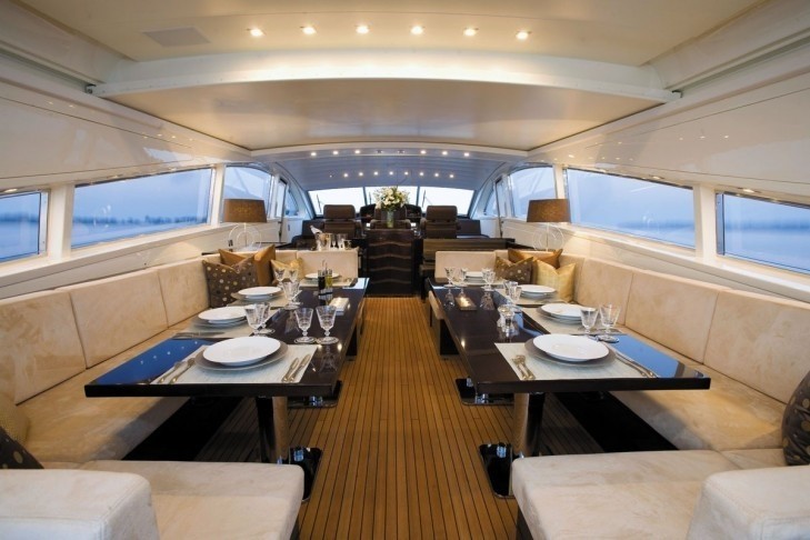 NOTABLE FEATURES for CARAMIA: Performance planing hull design ~ On-deck salon and dining perfect for entertaining ~ Contemporary interior decor ~ Wifi
