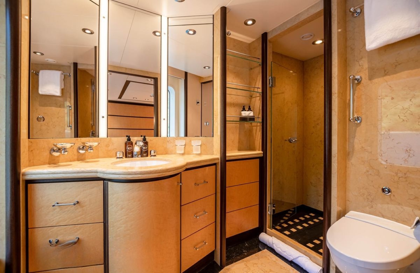 She is able to accommodate up to 12 guests in 5 luxurious staterooms plus 2 guests in a convertible private office. All cabins feature large windows providing plenty of natural light and harmony between the interior and exterior landscapes. The full-beam master Cabin boasts a king-sized bed and four guest’s cabins feature Queen Sized beds able to convert to a twin bed configuration. All cabins are uniquely located in the main deck giving an open feel to the cabins, with large windows allowing plenty of natural light to filter through. All cabins also feature private ensuite facilities.