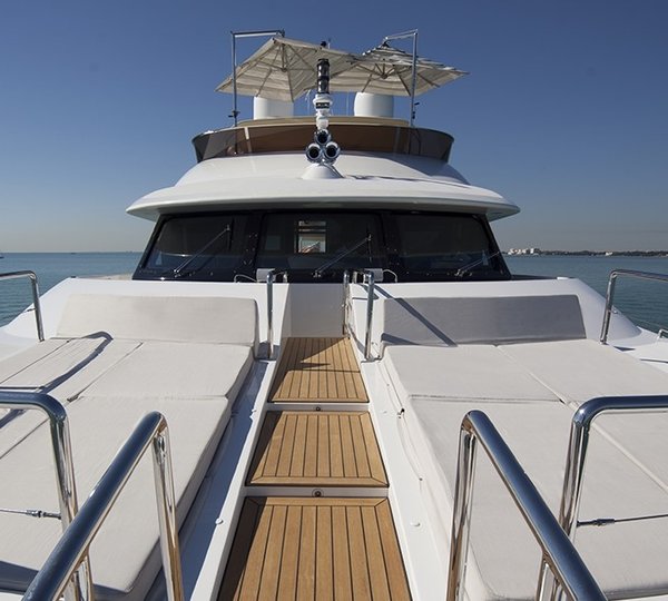 On the upper level, luxury yacht MINA boasts a lovely sky lounge with a bar and comfortable seating area. The sky lounge receives an exceptional view to the surrounding vistas or if you would prefer, the blinds can be closed to enjoy movies on the large screen TV. The sky lounge also has a games table perfect for those times guests prefer to retreat indoors. Forward of the Sky Lounge is the wheelhouse.