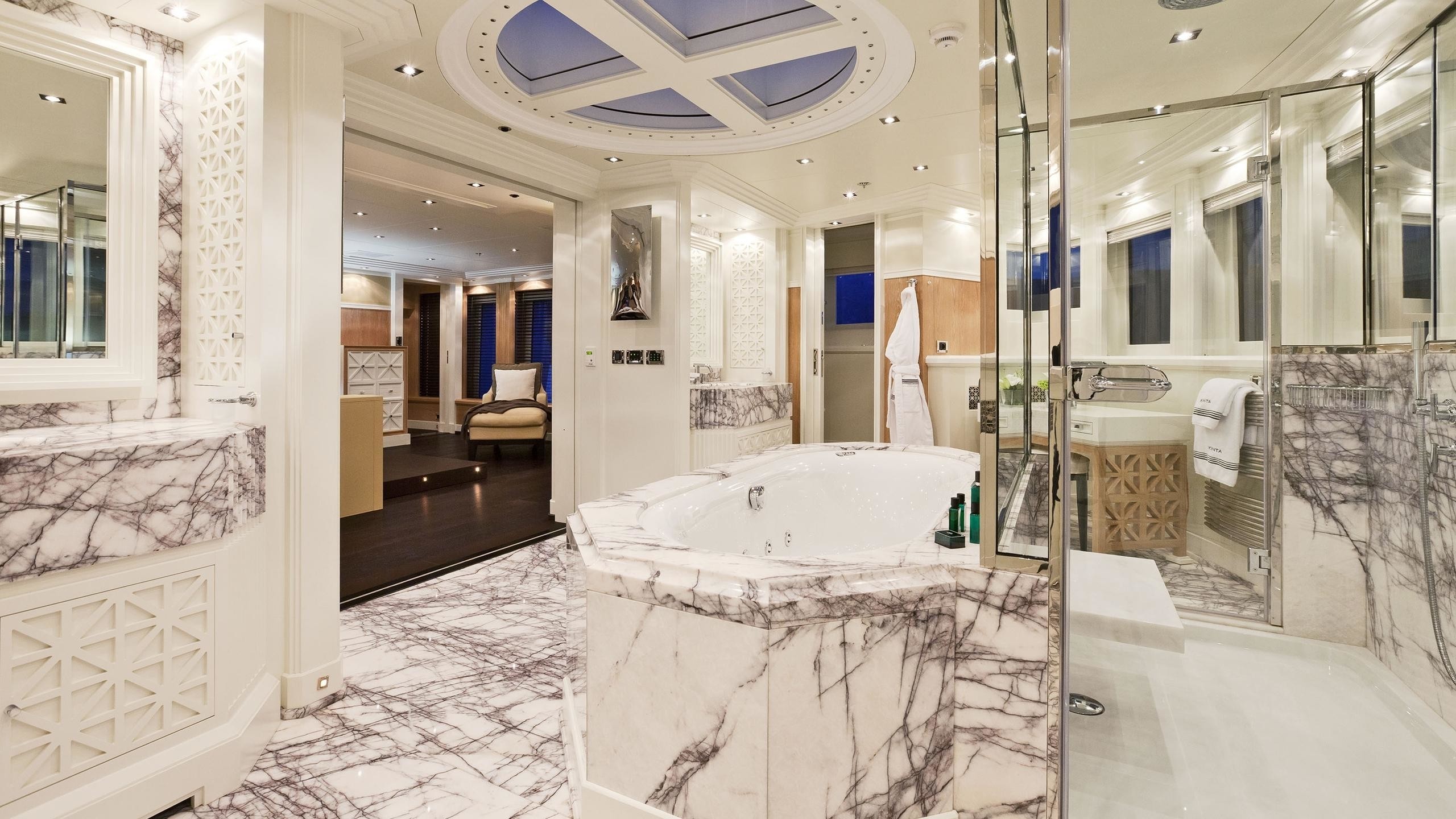 Forward of the main lobby is the oversized master cabin which extends across the full beam of the yacht and is again complimented with full height windows offering spectacular panoramic views. The master stateroom includes a private lounge and office, a large walk-in wardrobe and an ensuite bathroom. The master cabin also benefits from a private exit forward onto a decked terrace.