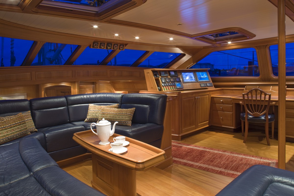 Sailing yacht Blue Too’s Pilothouse has informal seating and also a dining area featuring panoramic views. She boasts a full-width lower saloon with formal dining area for eight to starboard and a lounging and entertainment area with three sofas and coffee table to port. There is also a large centre cockpit with seating, dining table and coffee table.