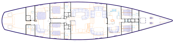 Luxury sailing yacht Blue Too offers comfortable and stylish accommodation for 6 people in 3 cabins in the following layout: 1 x master, 1 x double, 1 x twin, all with ensuites. A full-width master stateroom with separate seating and two bathrooms plus companionway to private aft cockpit with curved seating and coffee table which lowers to convert the seating into a sunbathing area. One of the cabins is double-bedded and one twin-bedded guest stateroom (which can be converted to a double), each with en suite shower room.