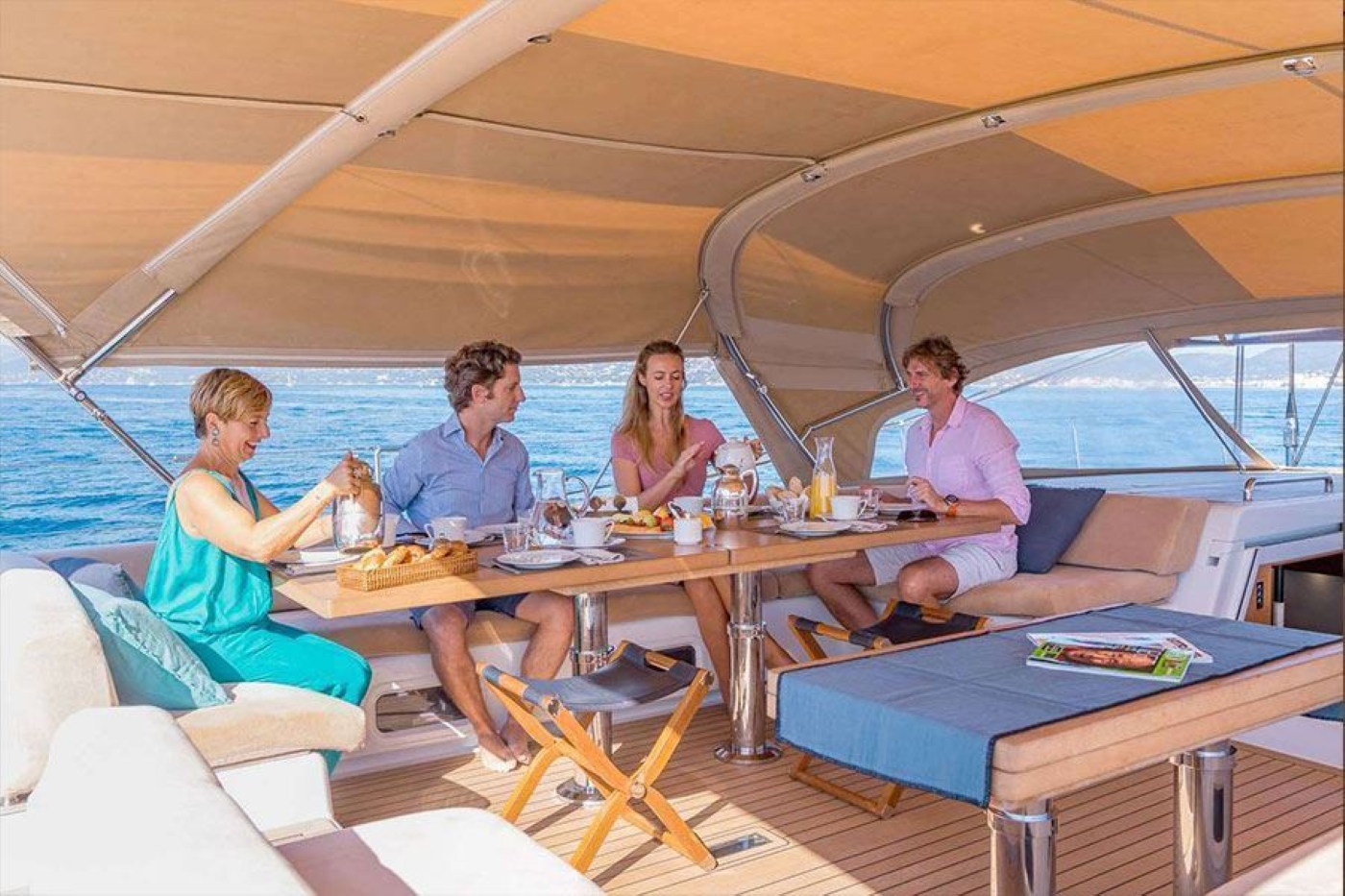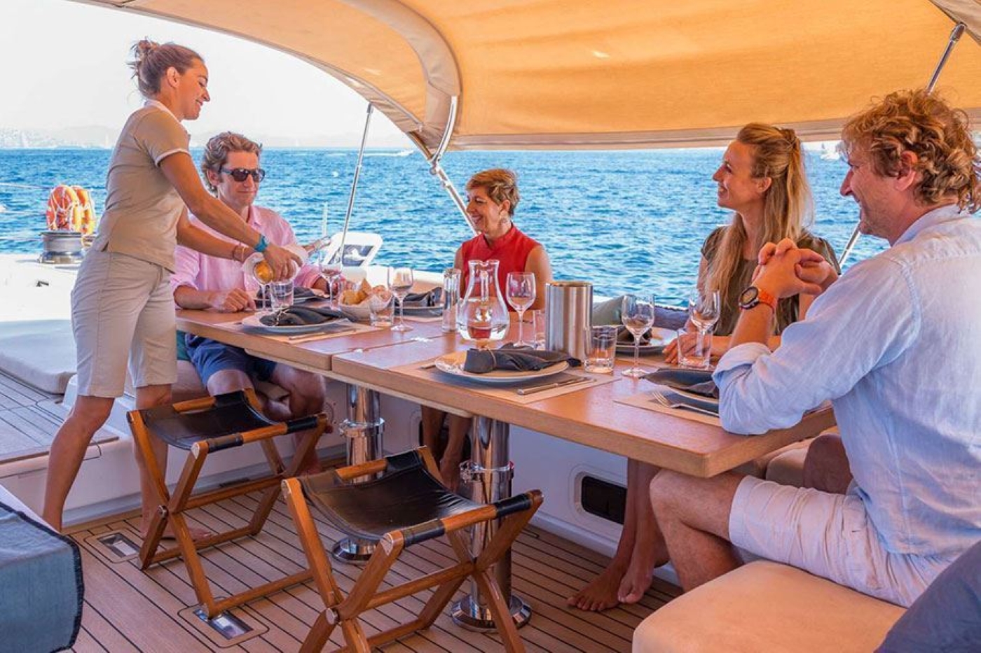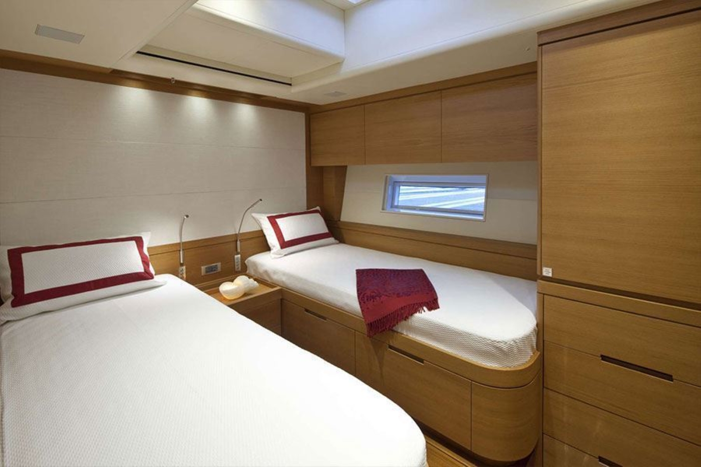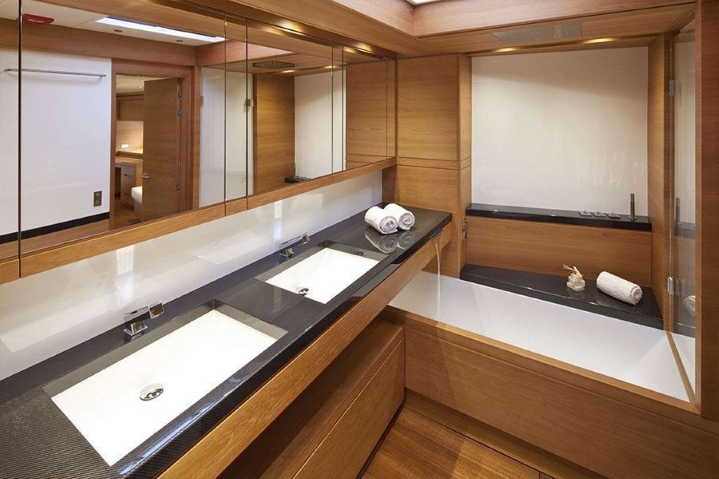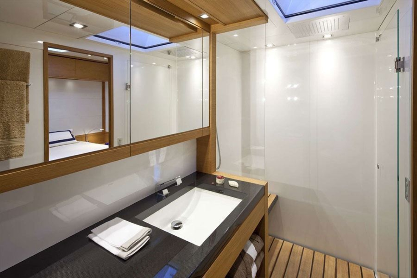 THALIMA provides accommodation for up to 8 charter guests in one Master cabin with a king-size bed and a full beam bathroom (with bath, bidet) with LED light therapy. The VIP cabin has a king-size bed and a spacious bathroom with carbon-fibre sinks and also with led light therapy. The two Twin bed cabins are both with en-suite bathroom.