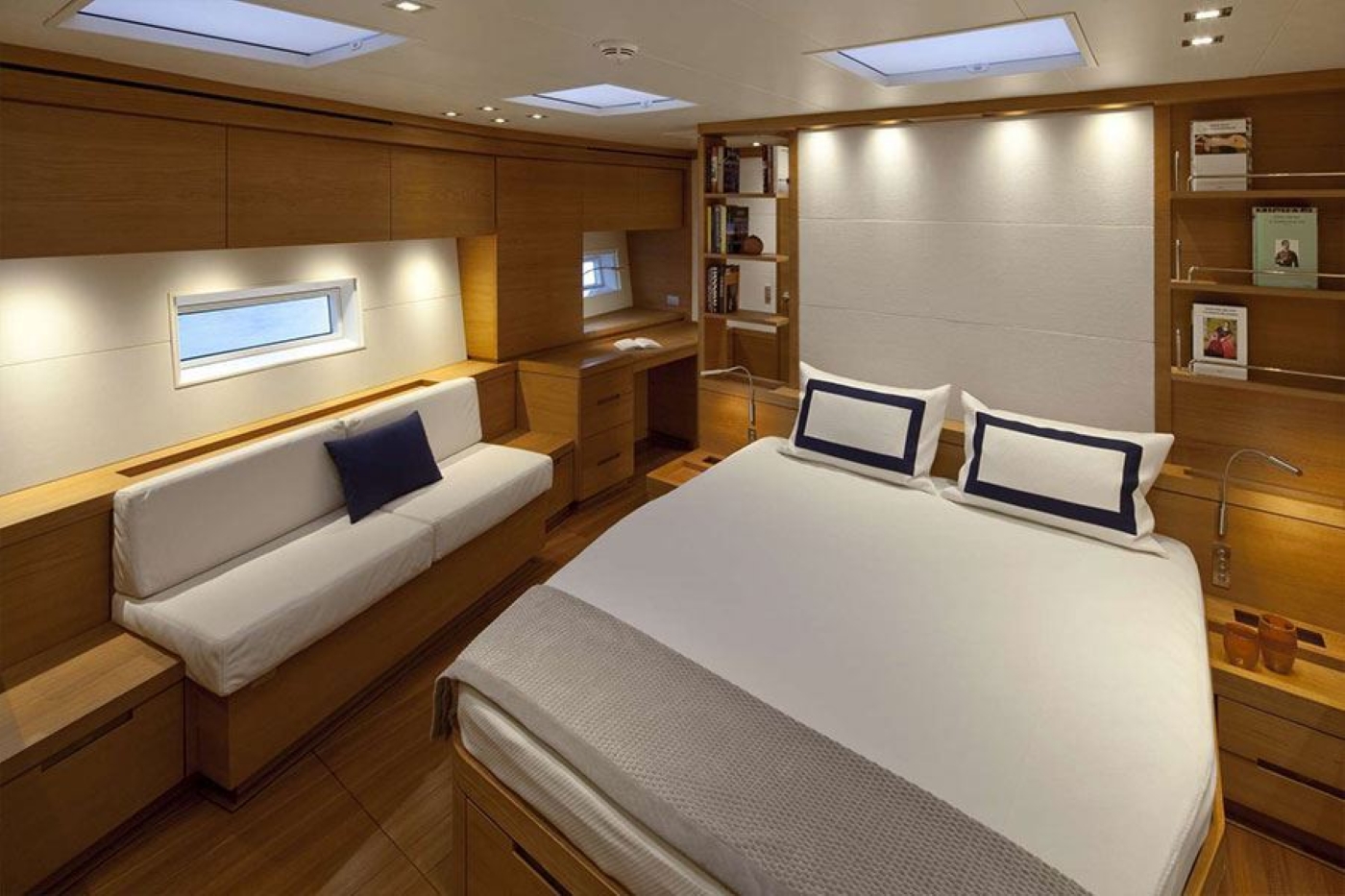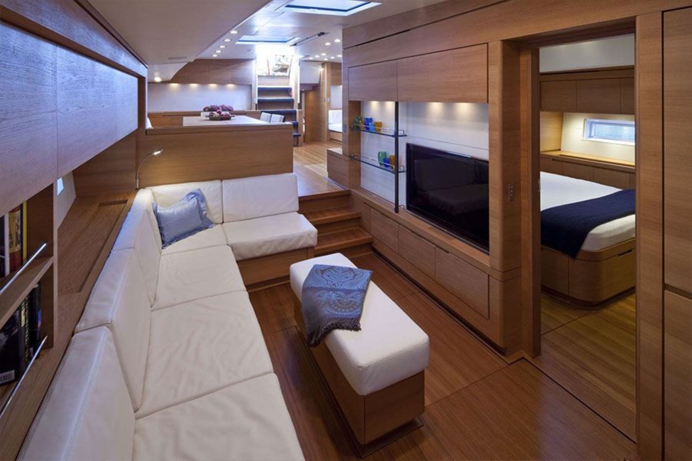 In the saloon, there is ample seating for guests port-side of the yacht with the dining area located starboard. Walking down the ship’s stairs there is another seating area that is fitted with a large-screen television to enjoy.