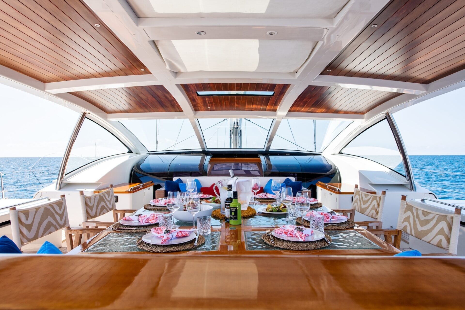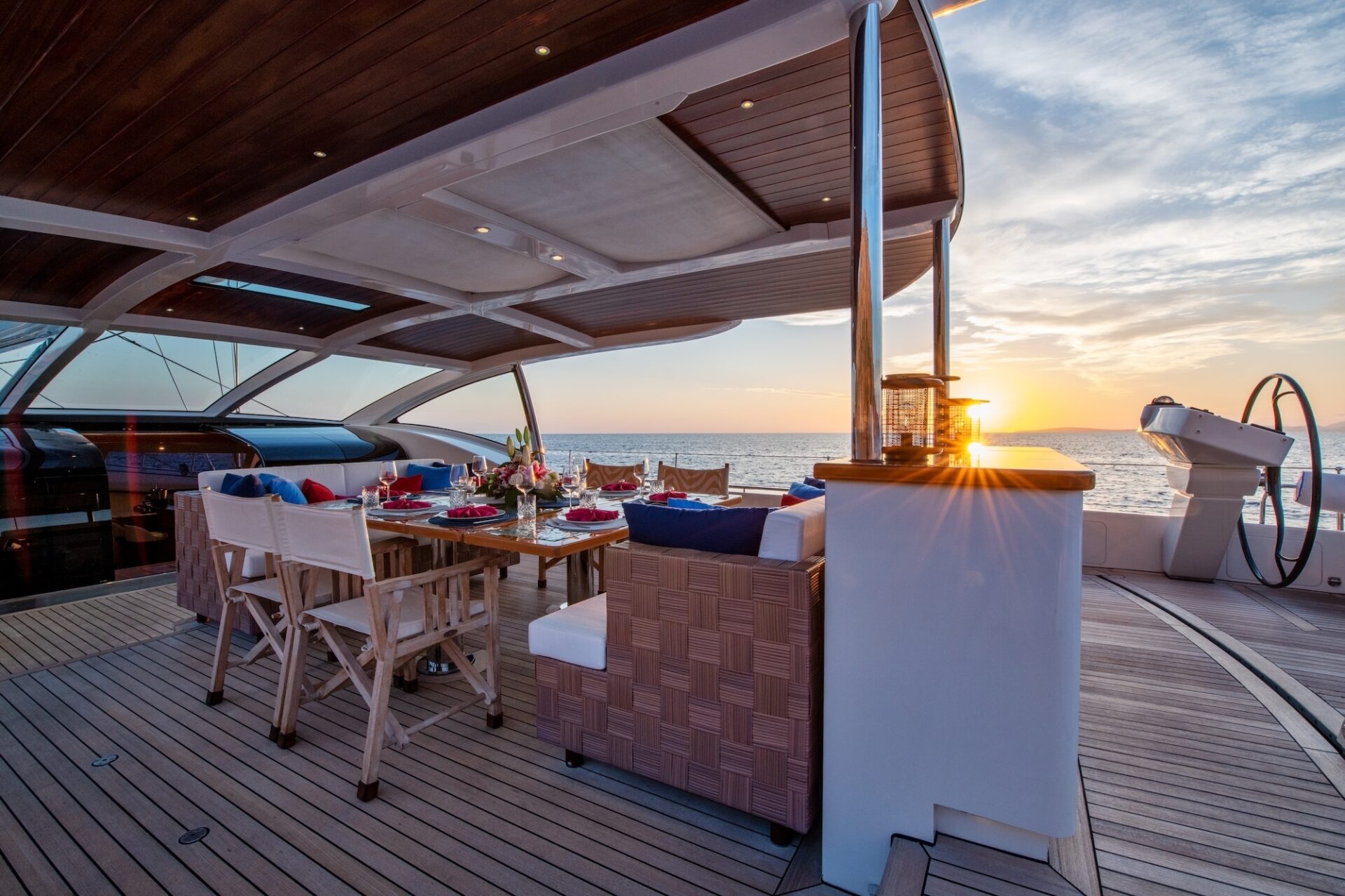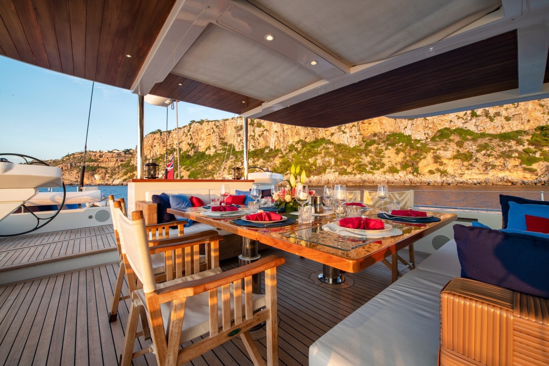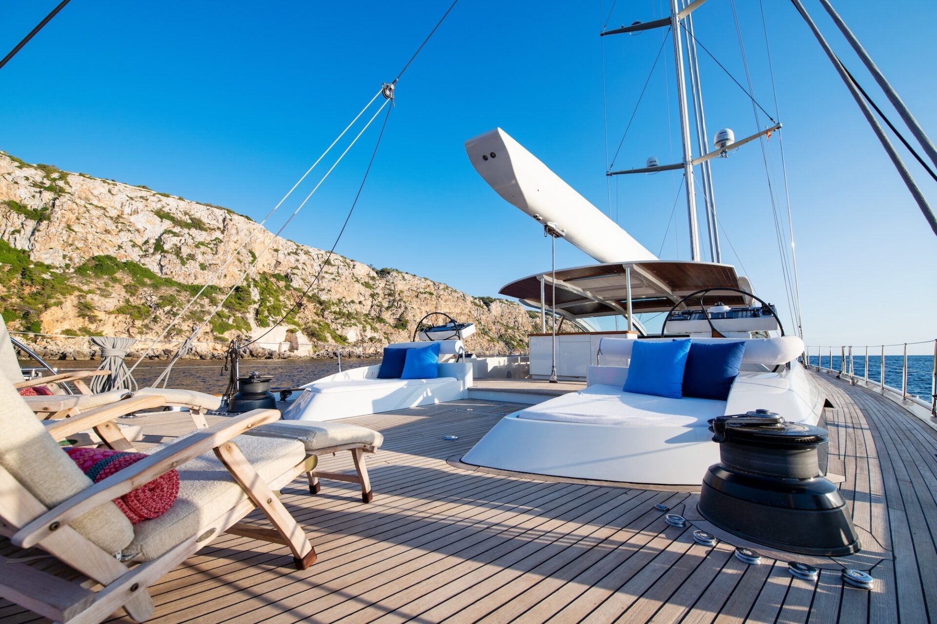 She provides duel steering positions with custom-built carbon fibre wheels with sunpads to aft. In the centre of the cockpit is a console carrying the sailing controls and instruments and navigation systems. Forward to the steering position is a dining area and a large sunpad area.