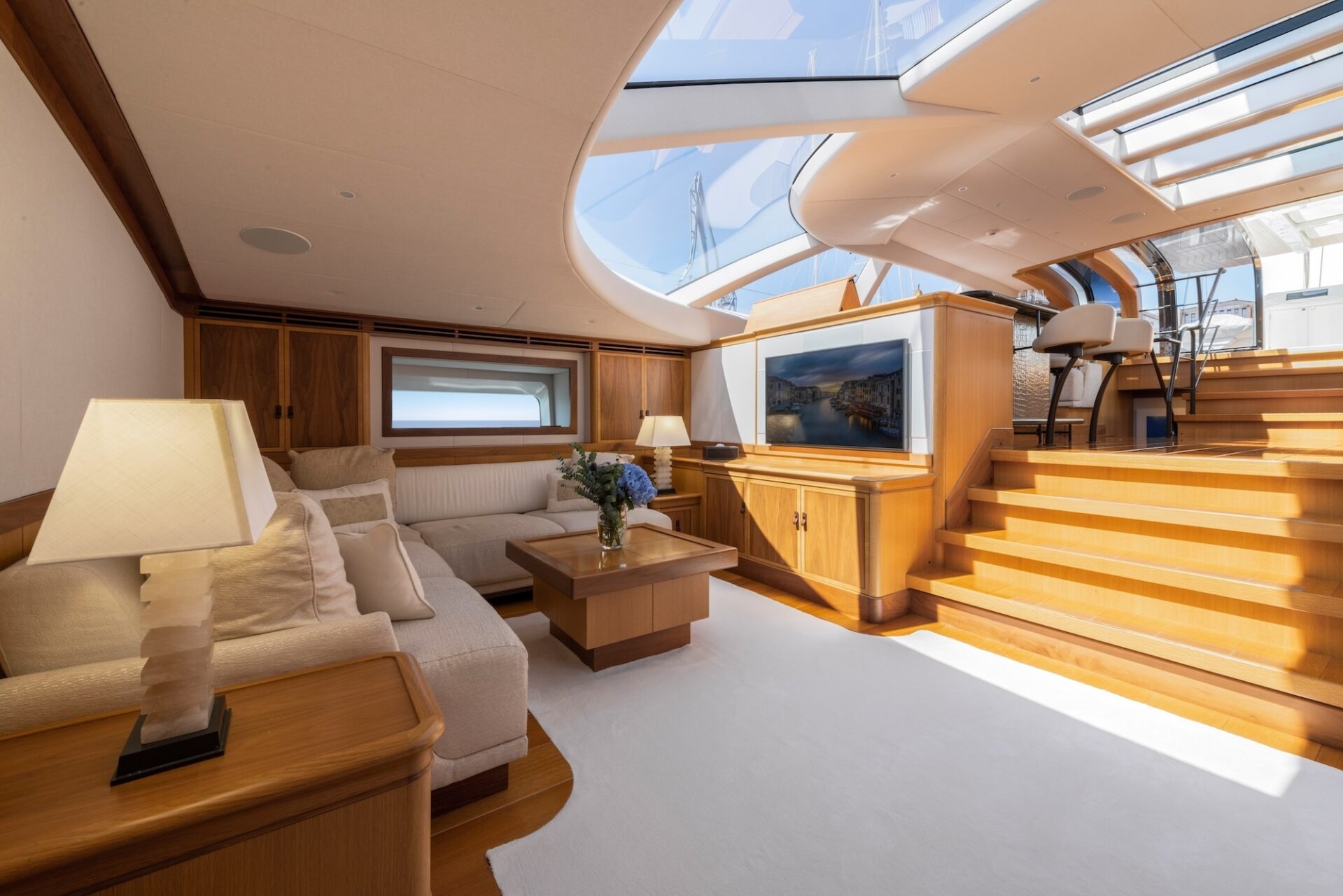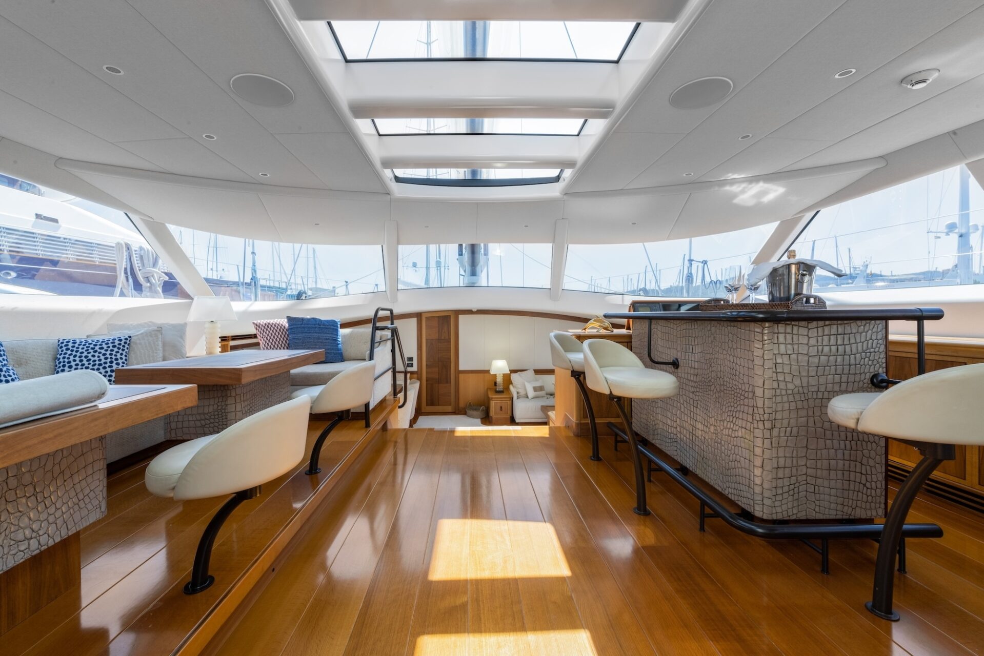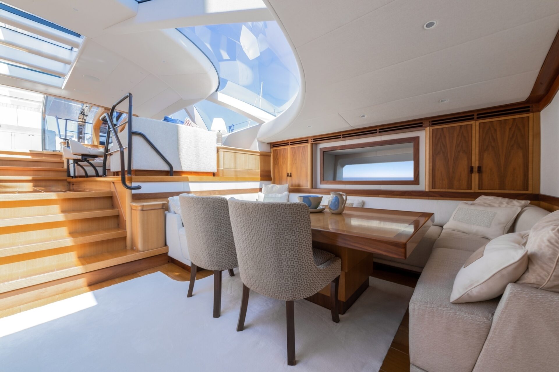 Another unique design feature is the layout on one level from the cockpit through the saloon and then down a few steps to the dining area, thus creating an expansive area for entertaining. Within the MES AMIS upper saloon, and adjacent to the bar, is the inside steering and navigation station with autopilot and engine controls.