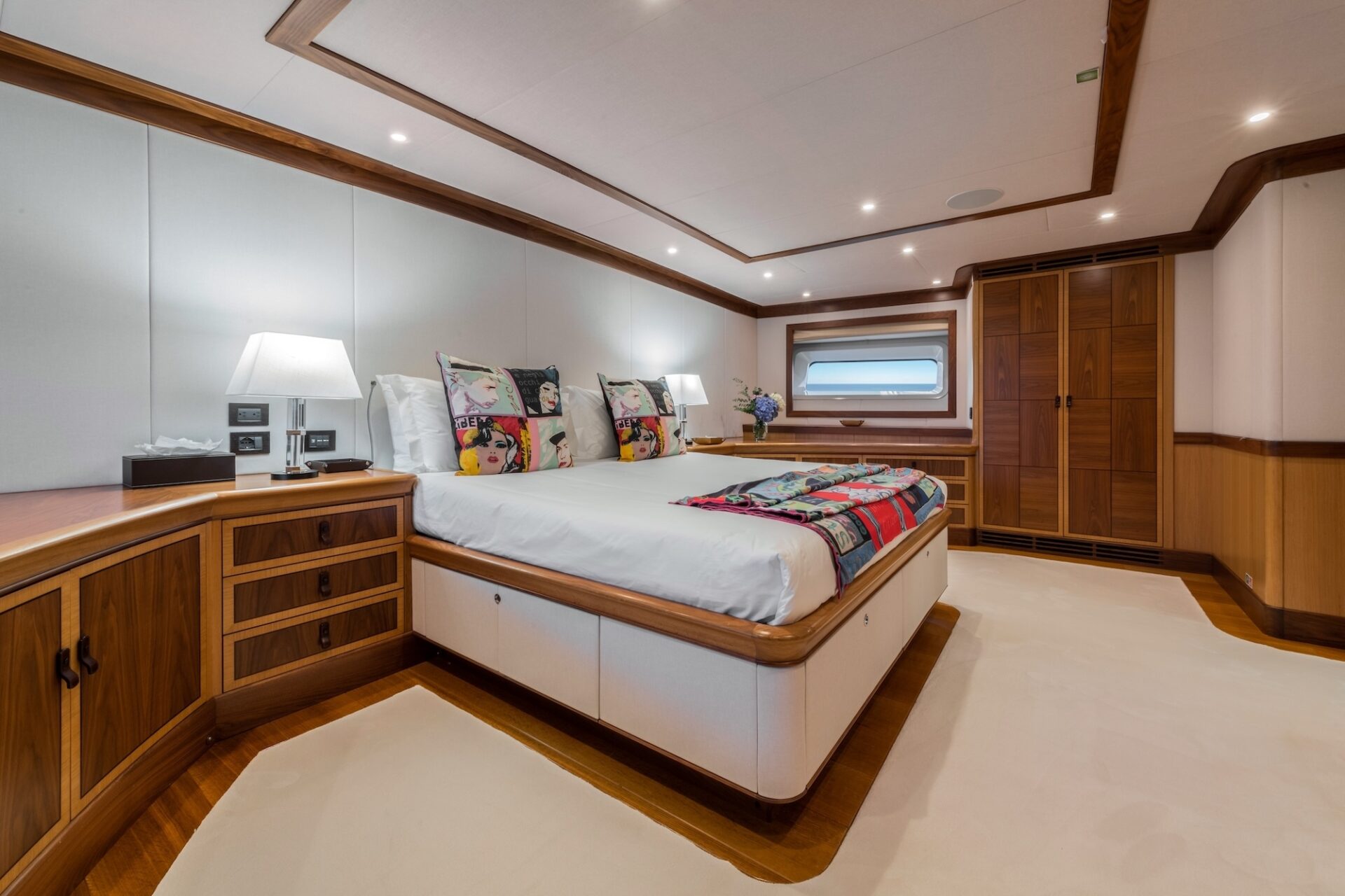 The yacht’s guest accommodation is extremely spacious with a full-width owners’ stateroom with a king-sized bed and en-suite bathroom. She offers wardrobes with ample clothes storage, a separate seating area and state of the art entertainment systems. Guest cabins include VIP double cabins, a twin-bedded cabin both with en-suite bathrooms. A further twin cabin is currently used as a gymnasium, has 2 Pullman berths and a fixed berth, also with en-suite facilities.