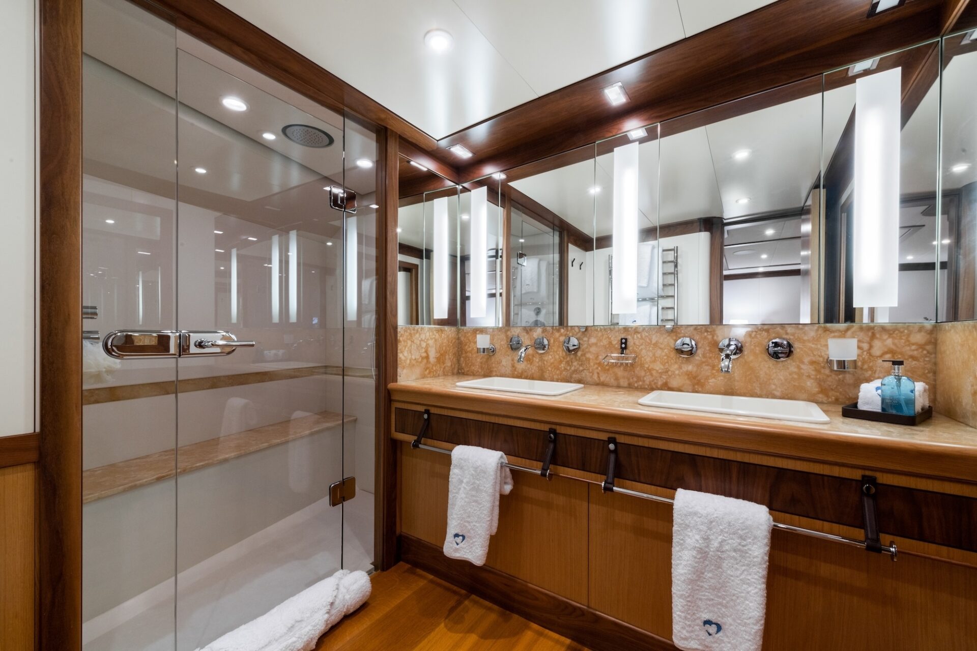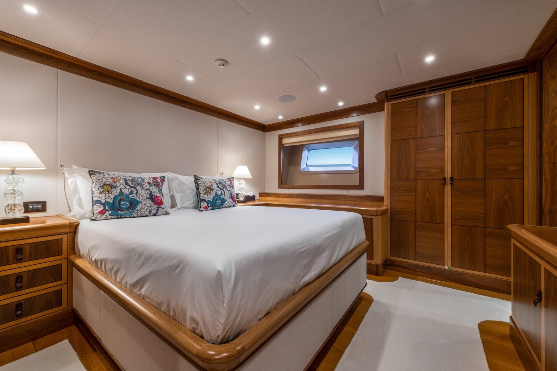 A beautifully appointed interior is the design work of Adam Lay Studios and includes a full-width owner's suite, three generous guest cabins and three crew cabins. Yacht MES AMIS's luxury interior makes lovely use of Oak and Walnut with Wenge and could be described as “warm, calm contemporary”. Her style of wooden joinery is simple, clean and crisp with a tactile countertop nosing incorporating a practical up-stand and a walnut bead for emphasis. The Walnut cornice gives a crisp emphasis between bulkhead and deckhead. Oak floor perimeters, in wide boards combined with natural cotton carpet in an off-white colour, reflect the light bulkheads and deck heads. Natural fibres maintain the feeling of calm. Leather, bronze, granite, onyx and slumped glass continue the ‘natural’ theme throughout the superyacht.
