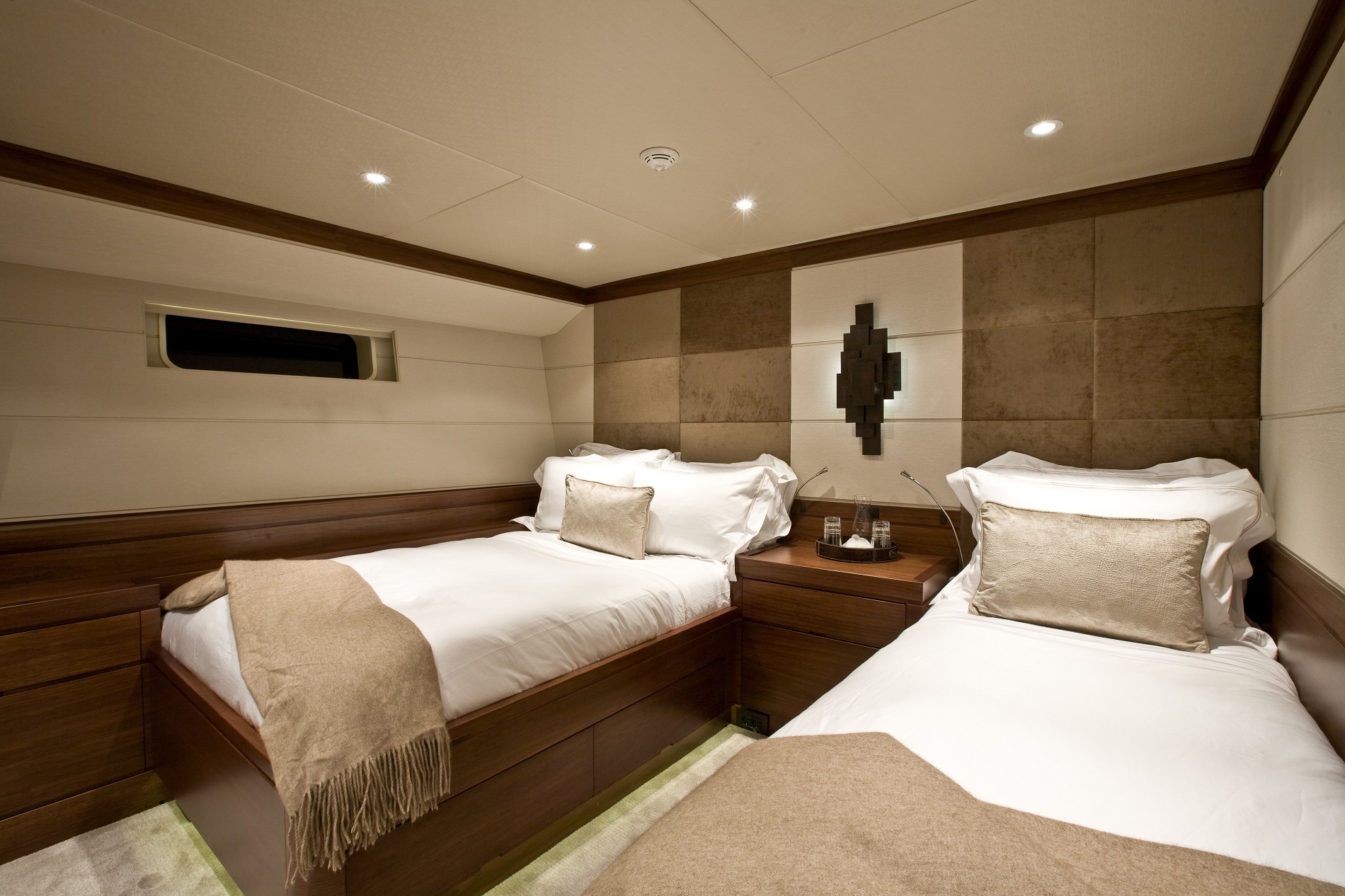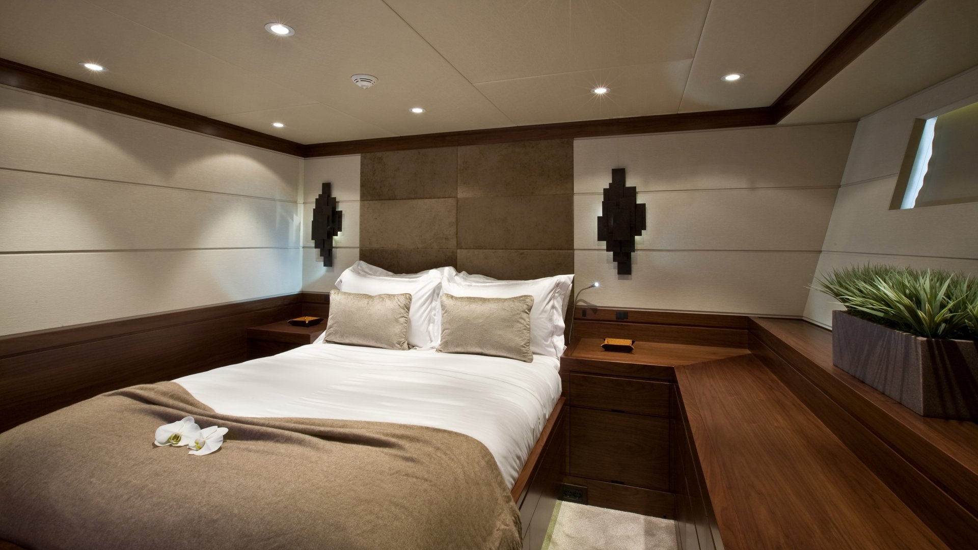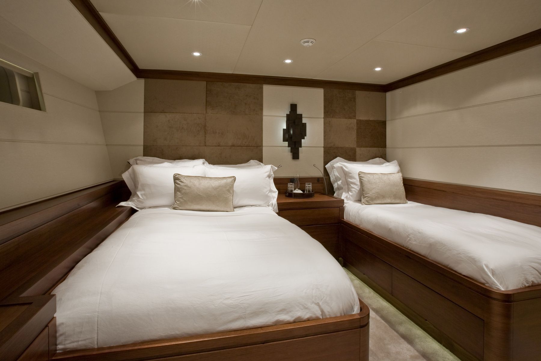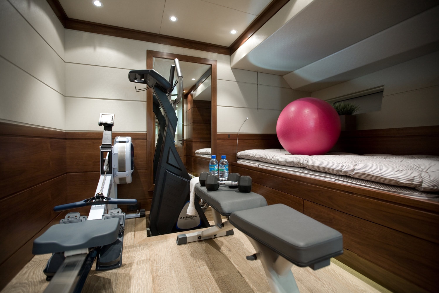 GITANA is able to accommodate 7 guests in 4 cabins. She has a full-width master stateroom featuring a large en-suite shower room and a very spacious VIP guest cabin with en-suite shower room. She has a further guest cabin offering a single, a small double and a Pullman which is an ideal configuration for children. There is also a twin cabin with twin beds and a pullman that doubles as a gym. Some of the gym equipment remains in this cabin.