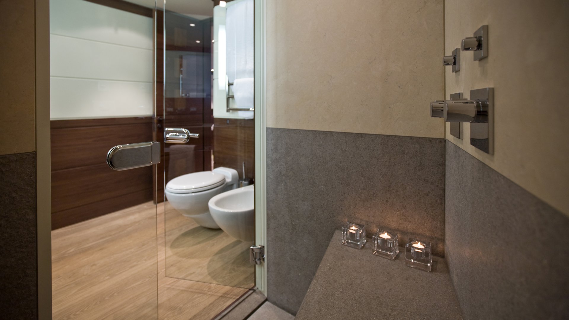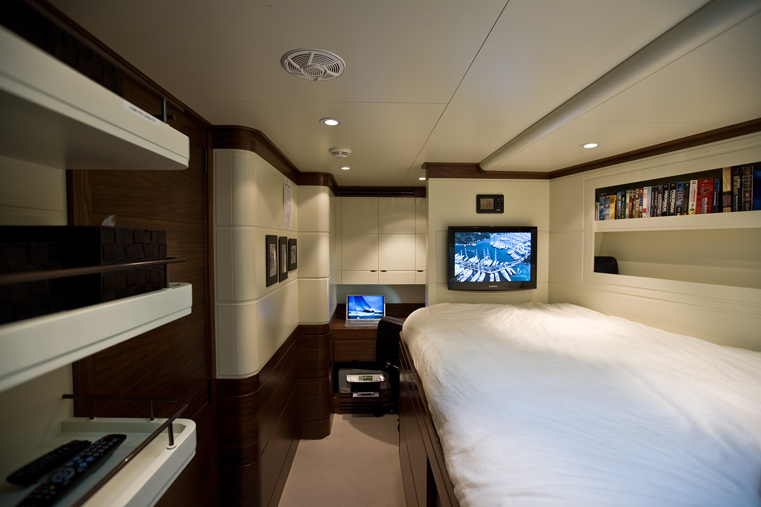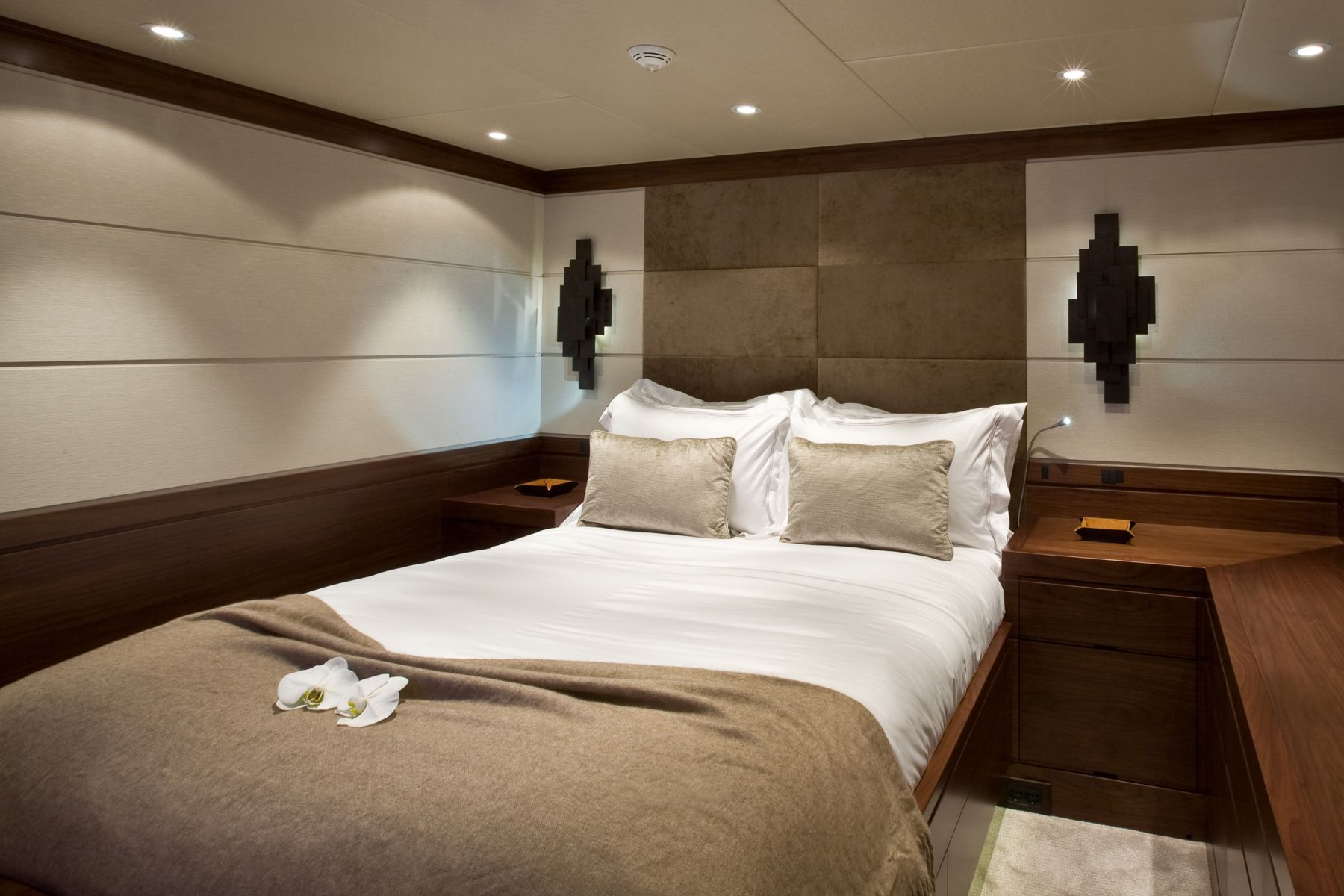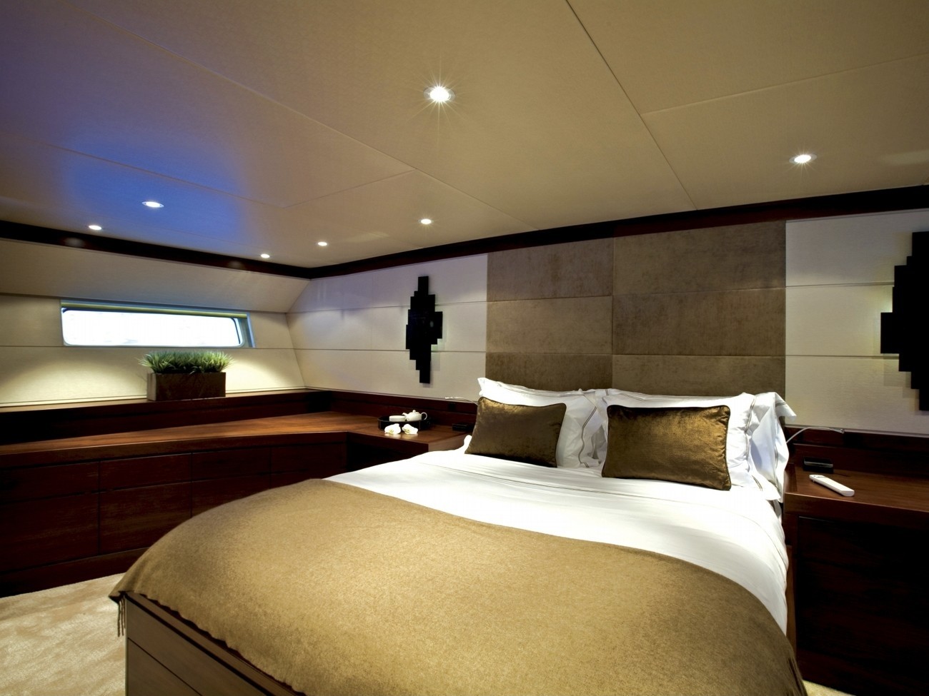GITANA is able to accommodate 7 guests in 4 cabins. She has a full-width master stateroom featuring a large en-suite shower room and a very spacious VIP guest cabin with en-suite shower room. She has a further guest cabin offering a single, a small double and a Pullman which is an ideal configuration for children. There is also a twin cabin with twin beds and a pullman that doubles as a gym. Some of the gym equipment remains in this cabin.