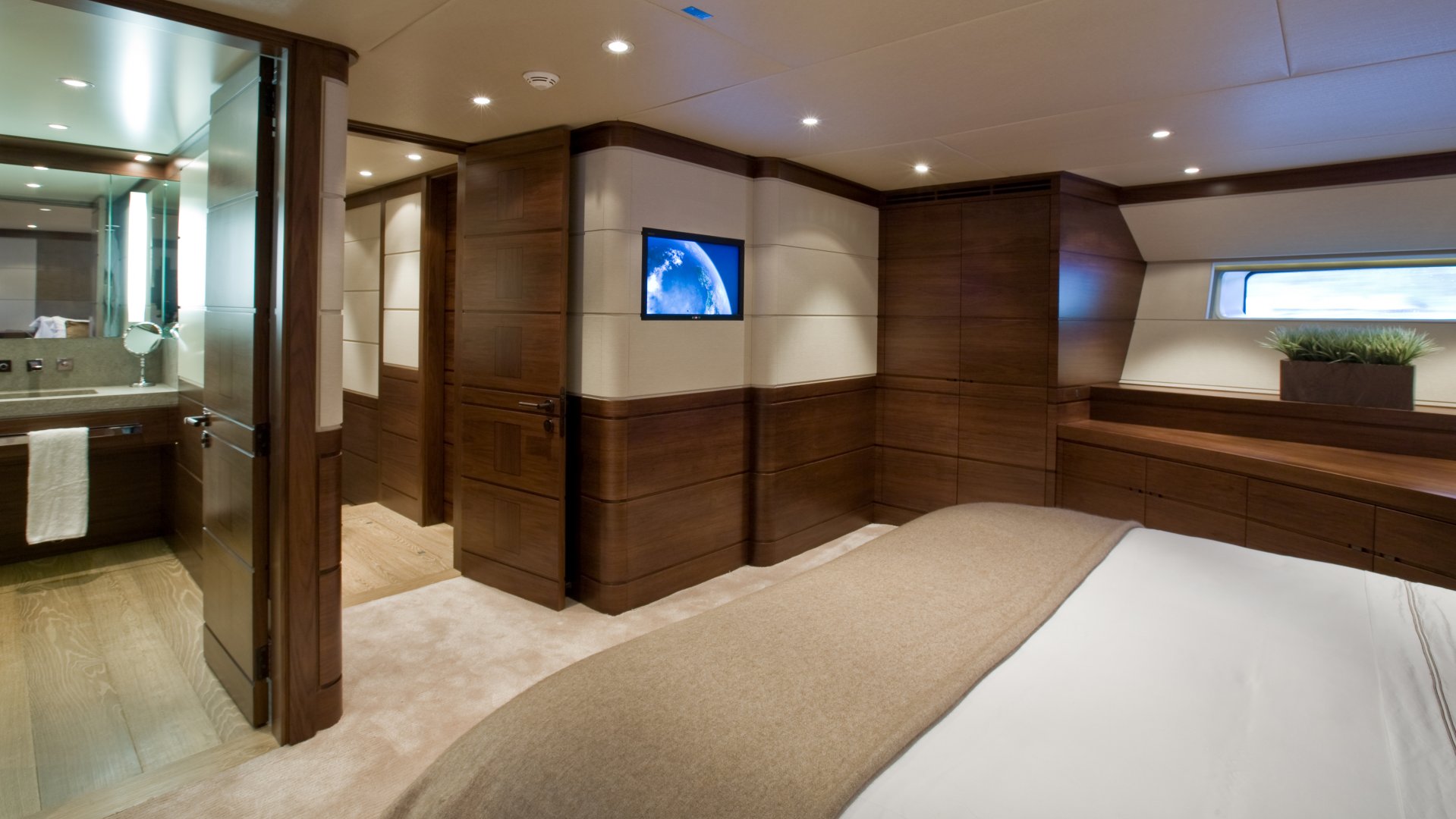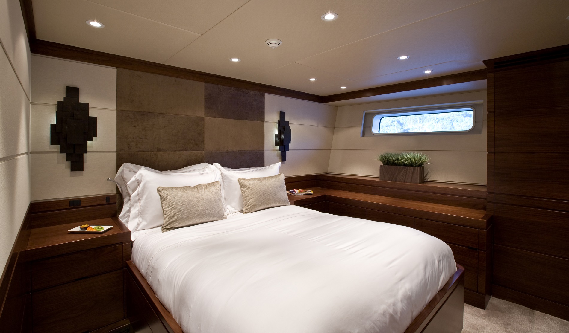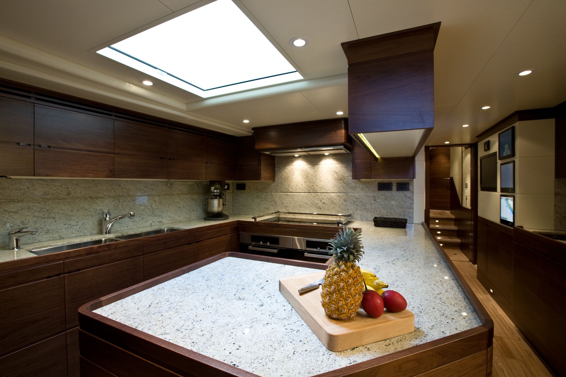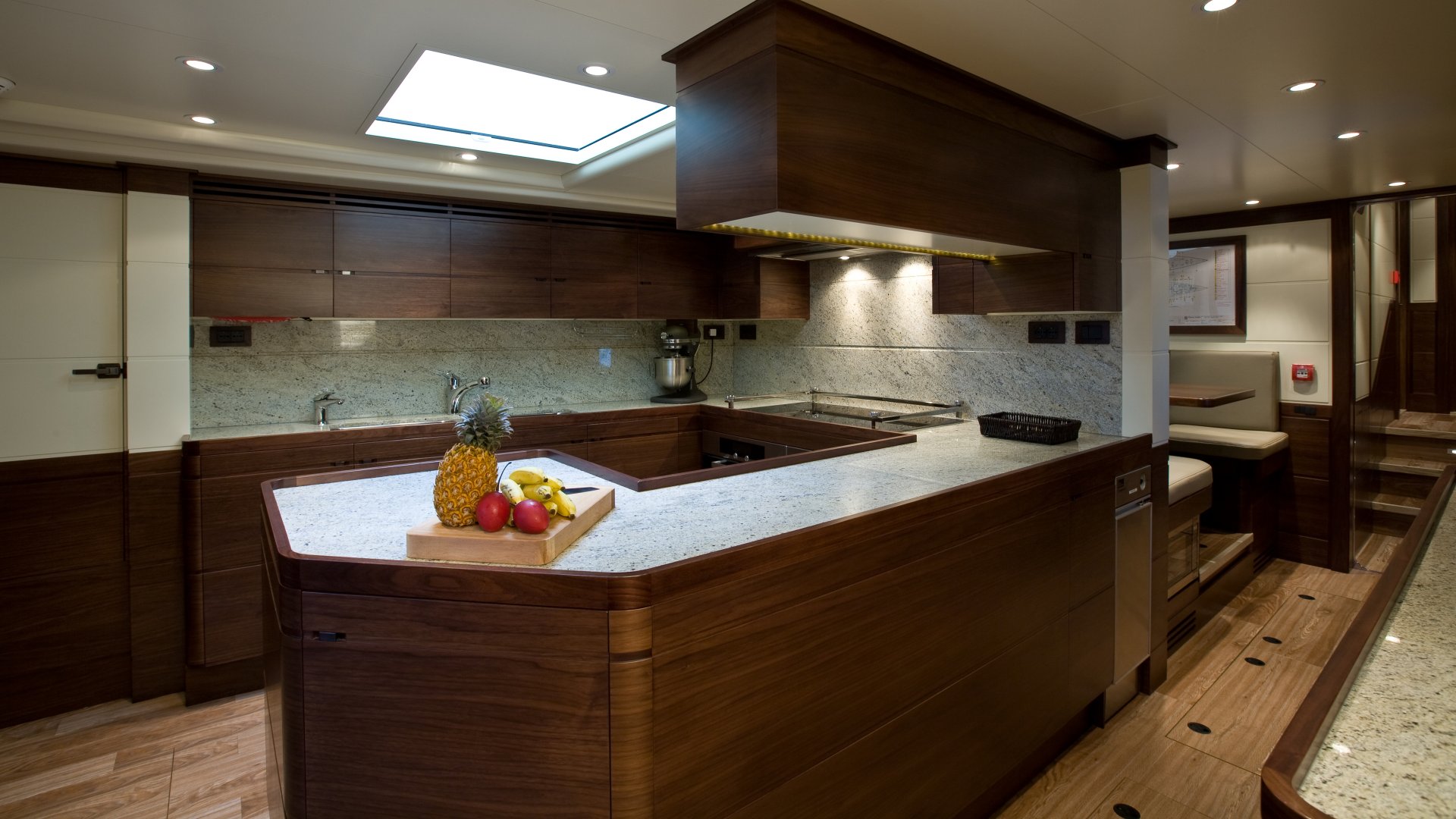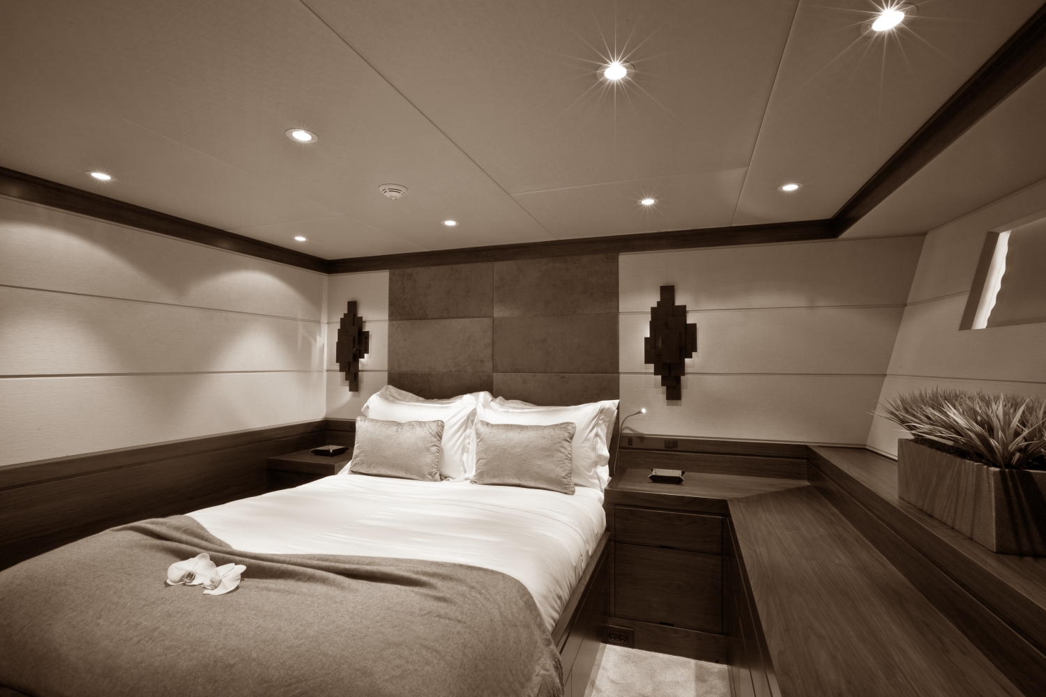 GITANA received two Best Sailing Yacht awards. Through experience and detailed refinements, she has been built for even better sailing performance as well as sleek aesthetics. The yacht boasts carefully crafted negative detail on the attractive walnut cabinetry that is a feature throughout. Other impressive details include custom treatment on imported door latches and light switches. She features a clean, contemporary atmosphere and high functionality throughout the yacht.
