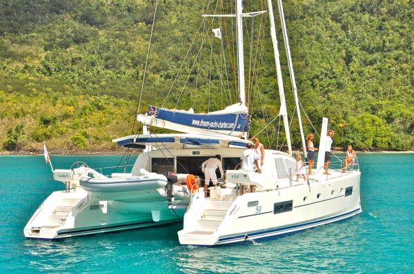 The Catana 50 Ocean Class Sailing Catamaran is available for bareboat charter in the Caribbean incorporating both the Leeward and the Windward Islands which include base locations of Tortola, St Martin, Guadeloupe and Martinique. The new design, by Christophe Barreau, with its unique self-supporting bimini increases forward visibility and offers space for solar panels and a comfortable sun lounge and for easy access to the water you will also find a swim platform at the rear.