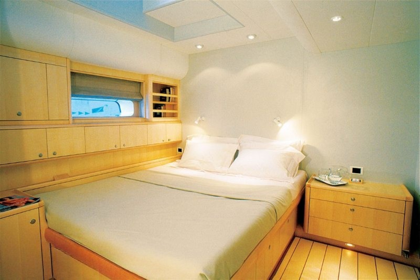 VAIMITI boasts a modern and spacious interior. Light maple wood is highlighted by natural light through the deck salons panoramic windows. Guests can relax in air-conditioned comfort in the deck salon or outside in the spacious and comfortable open-air cockpit that is protected from the sun by a bimini awning. The stern stairway and swimming platform allow easy access to the sea for snorkeling, swimming, water sports and embarking the yacht's tender.