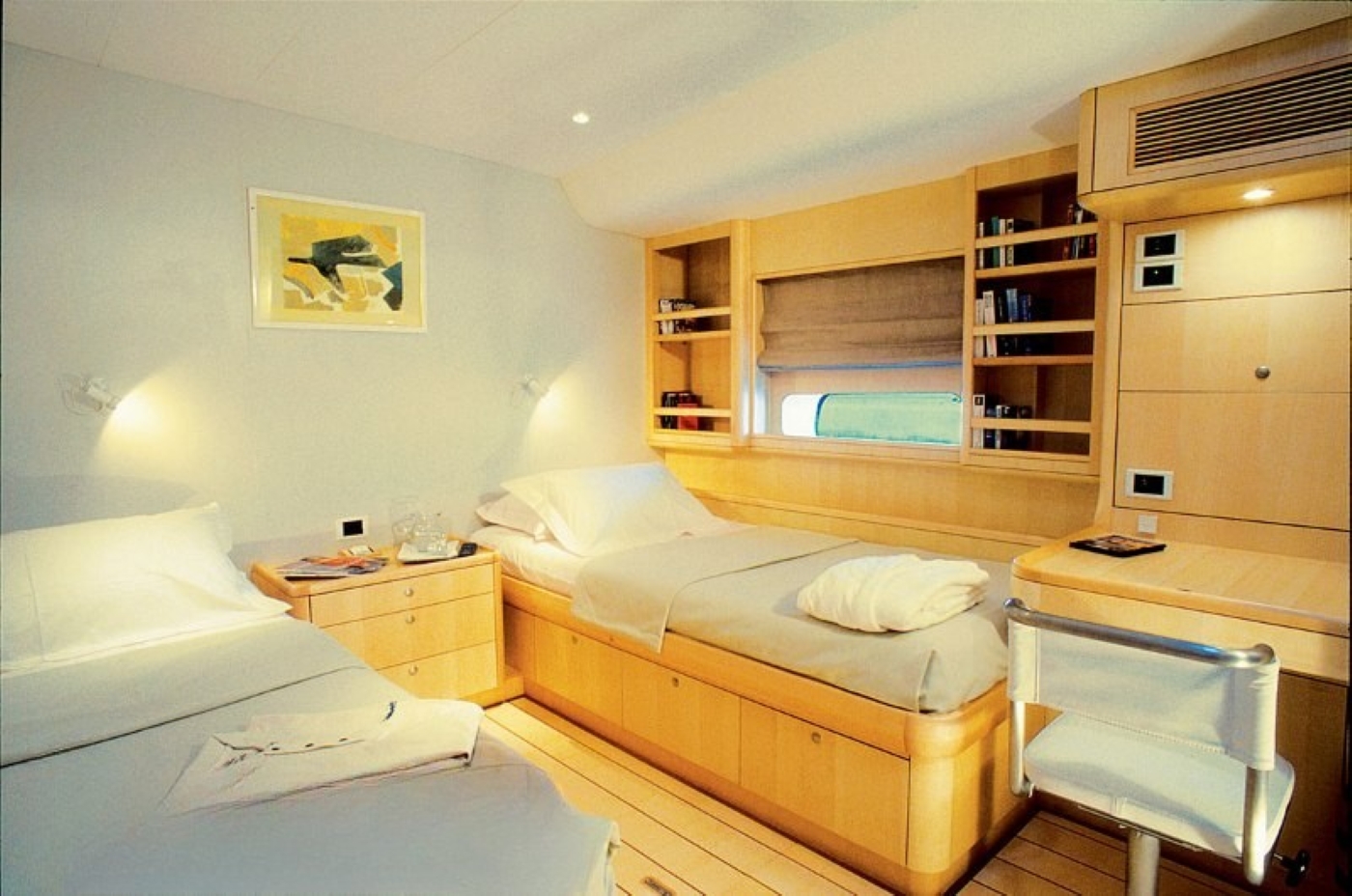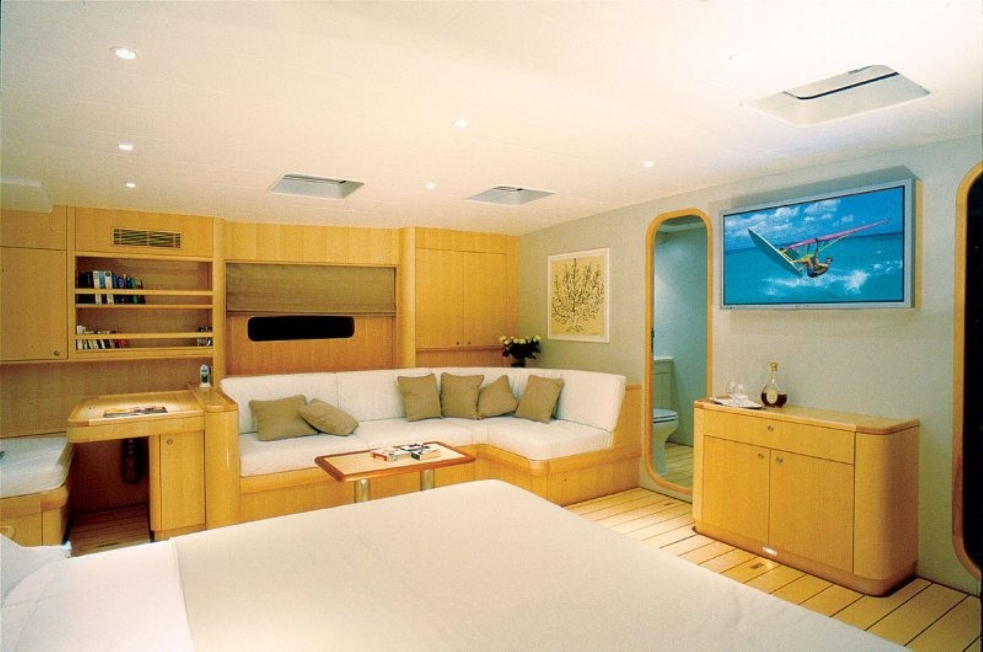 Mediterranean & Caribbean luxury performance sailing yacht VAIMITI offers comfortable and stylish accommodation for 8 charter guests in 4 cabins. She is capable accommodating extra children with the use of pullman berths. The master cabin boasts a king size bed, his and hers en suite bathrooms with a shower and head in each. This cabin is extremely comfortable, with full beam width. It has a sofa, a writing desk, an L-shape settee and a large LCD screen. The VIP guest cabin has a king size bed, as well as an en suite bathroom with a shower and head. Two guest cabins comprise twin beds, pullmans, and en suite bathrooms with showers and heads too. All guest cabins are equipped with LCD screens, DVD and music systems.