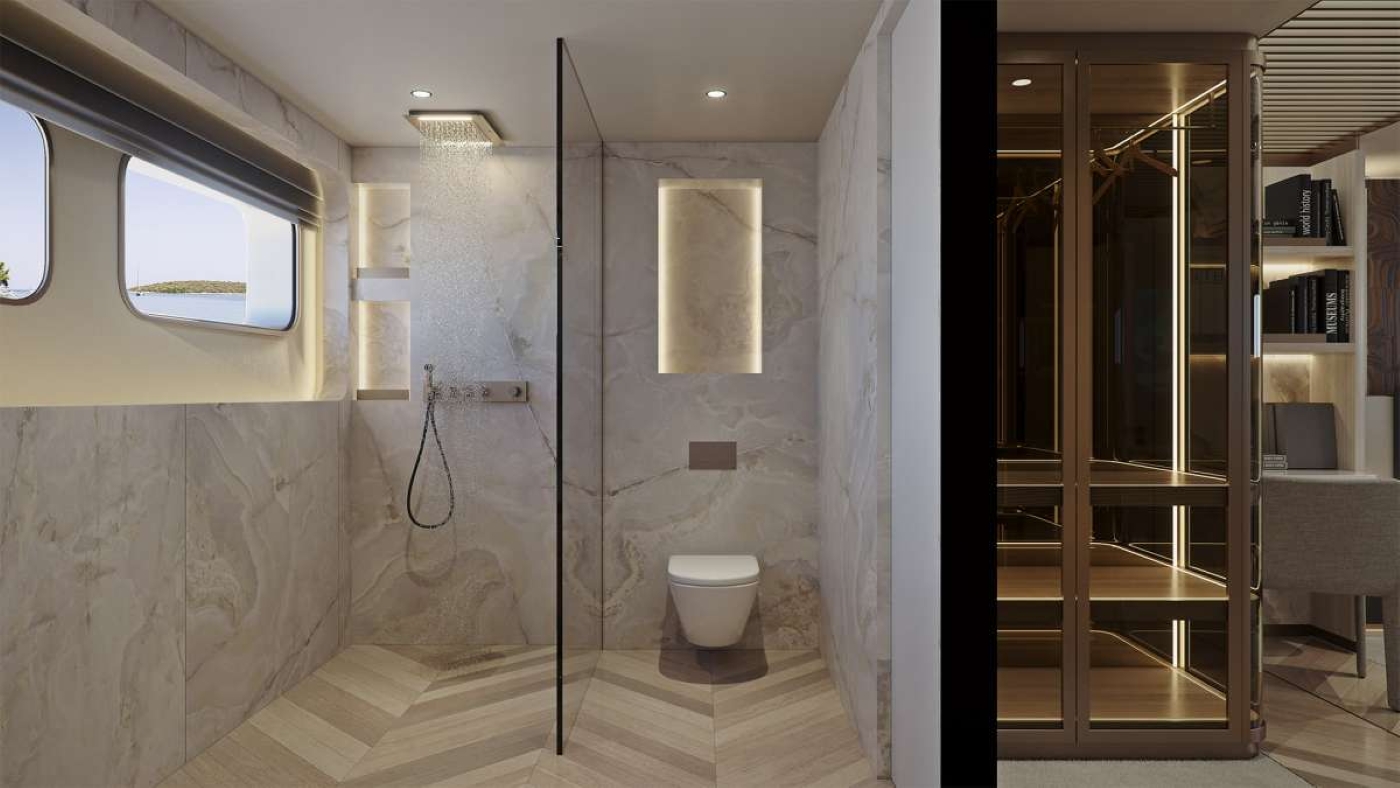 ~ Master Suite: Full-beam with king bed, lounge area, walk-in wardrobe, and ensuite with marble finishes ~ VIP Suite: 27m² full-beam cabin with king bed, desk, lounge and ensuite ~ 2 x Convertible Cabins: Twin or king configuration, each with ensuite bathroom ~ 2 x Double Guest Cabins: Each with king bed and ensuite ~ All cabins include smart TVs, minibars, safes and luxury finishes