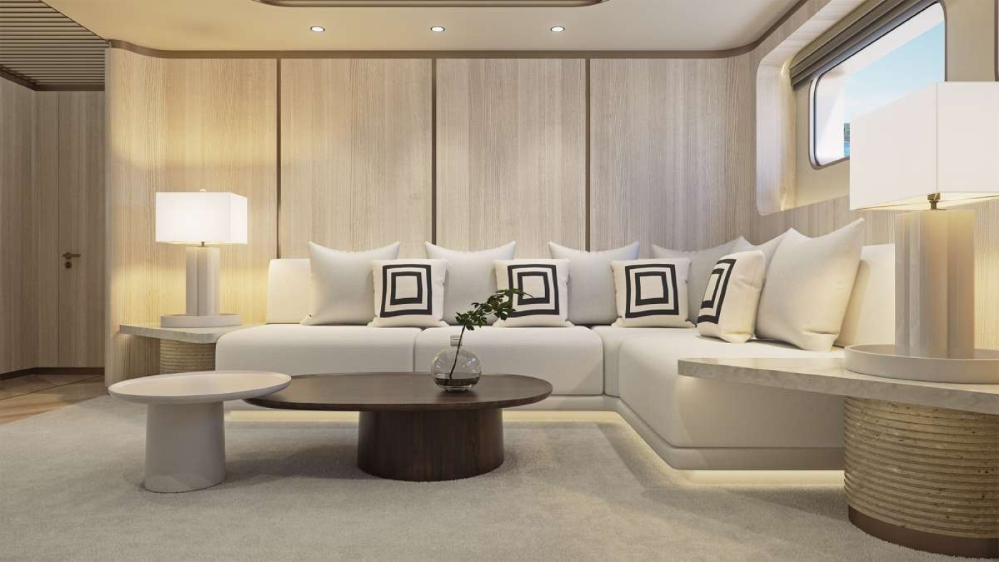 On the upper deck, a circular dining table seats 12 for starlit meals with panoramic views, while the sundeck features a six-person Jacuzzi, sun loungers and soft, curved furniture beneath sleek architectural overhangs. Sun awnings, outdoor bars, and ambient lighting ensure round-the-clock comfort across her open spaces.